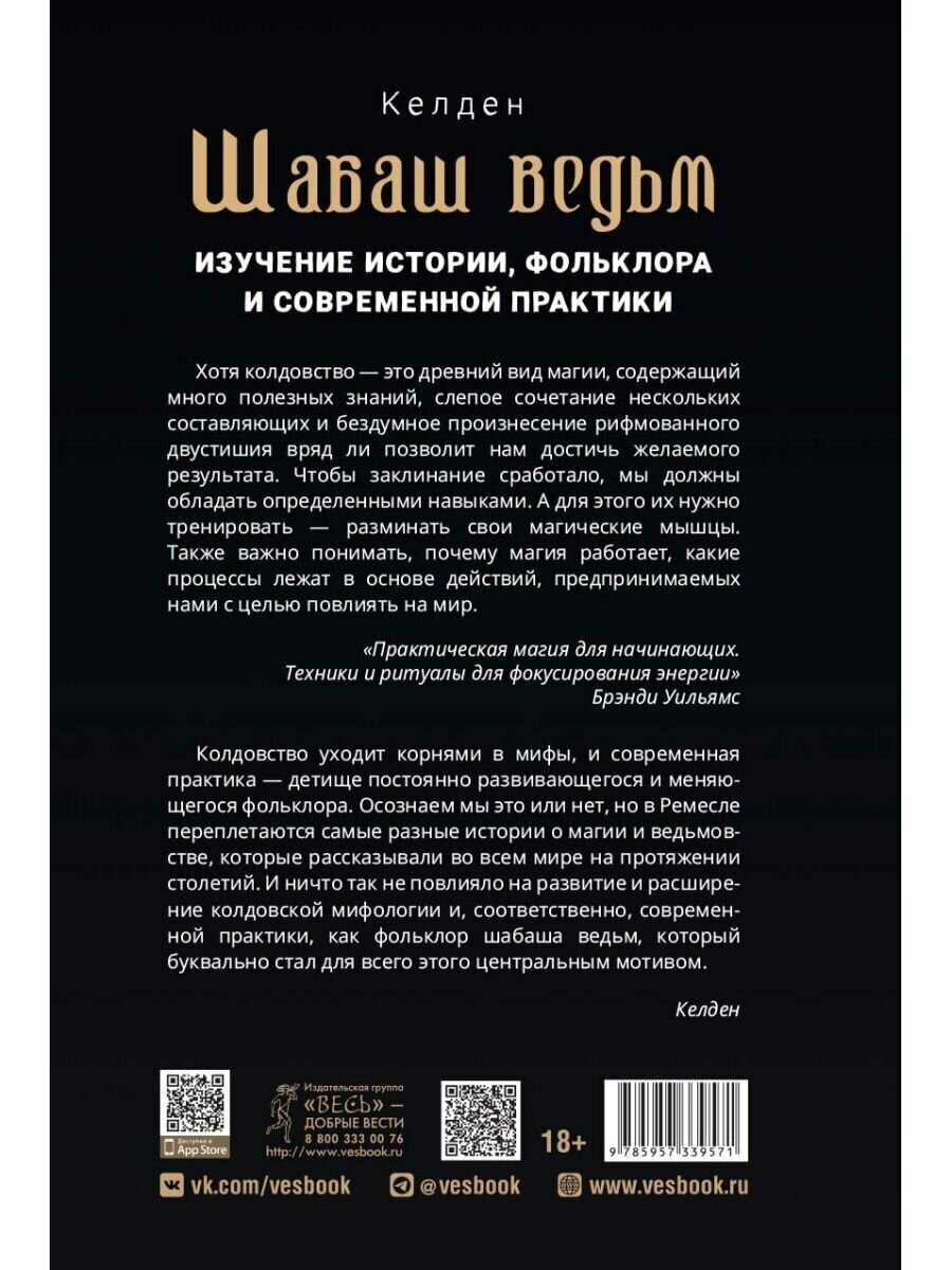 Эта книга представляет собой всесторонний, емкий и точный обзор древних верований, связанных с шабашем ведьм, а также практическое введение в интересную и самобытную современную традицию, которая эти верования воплощает. Келден предоставляет множество тщательно отобранных свидетельств из истории, фольклора и искусства, из американских и европейских источников, с полным набором ссылок, чтобы обеспечить прочную основу для понимания концепции шабаша ведьм и того, как она развивалась на протяжении веков. Академический материал, представленный в доступной форме, сочетается с полезной практической информацией для современных практиков, желающих самостоятельно изучить шабаш ведьм и даже принять в нем участие.