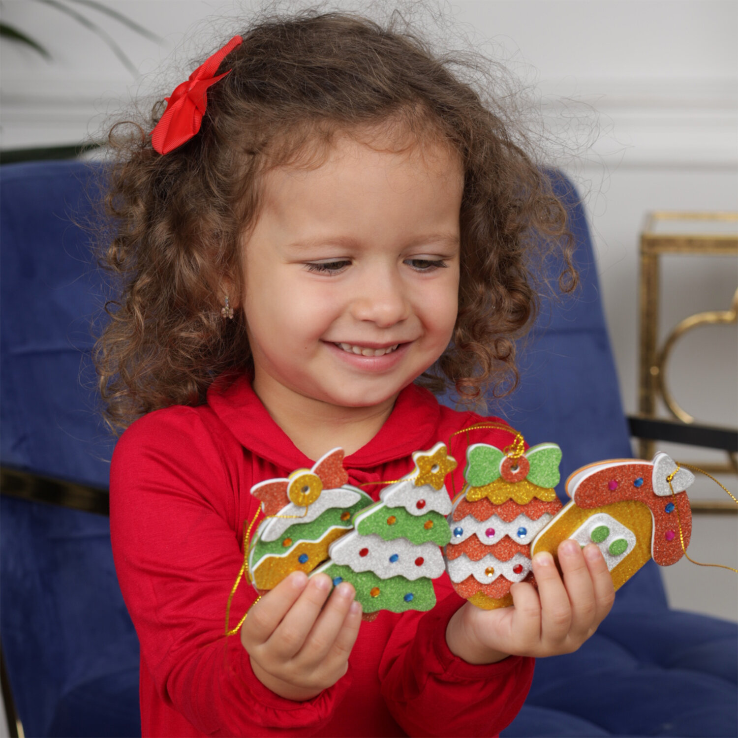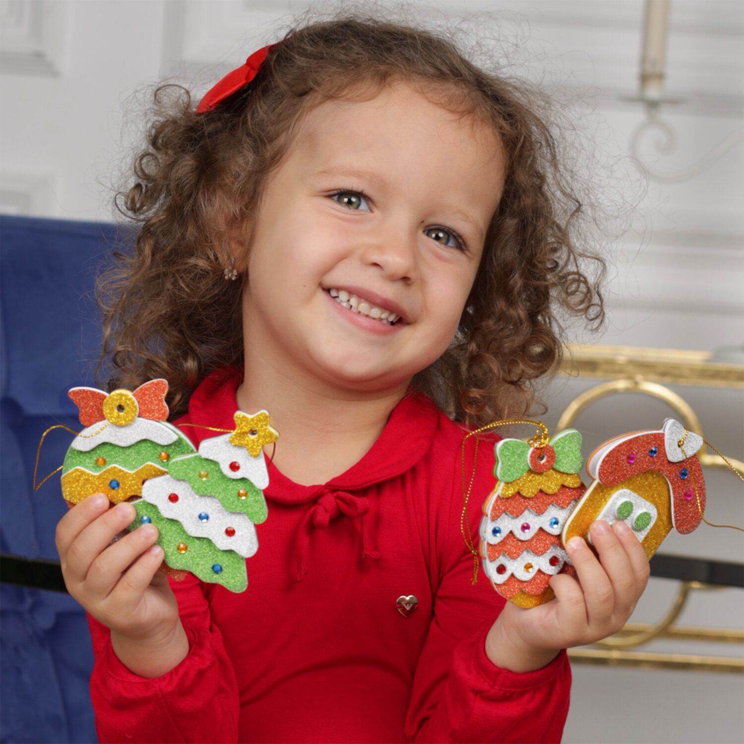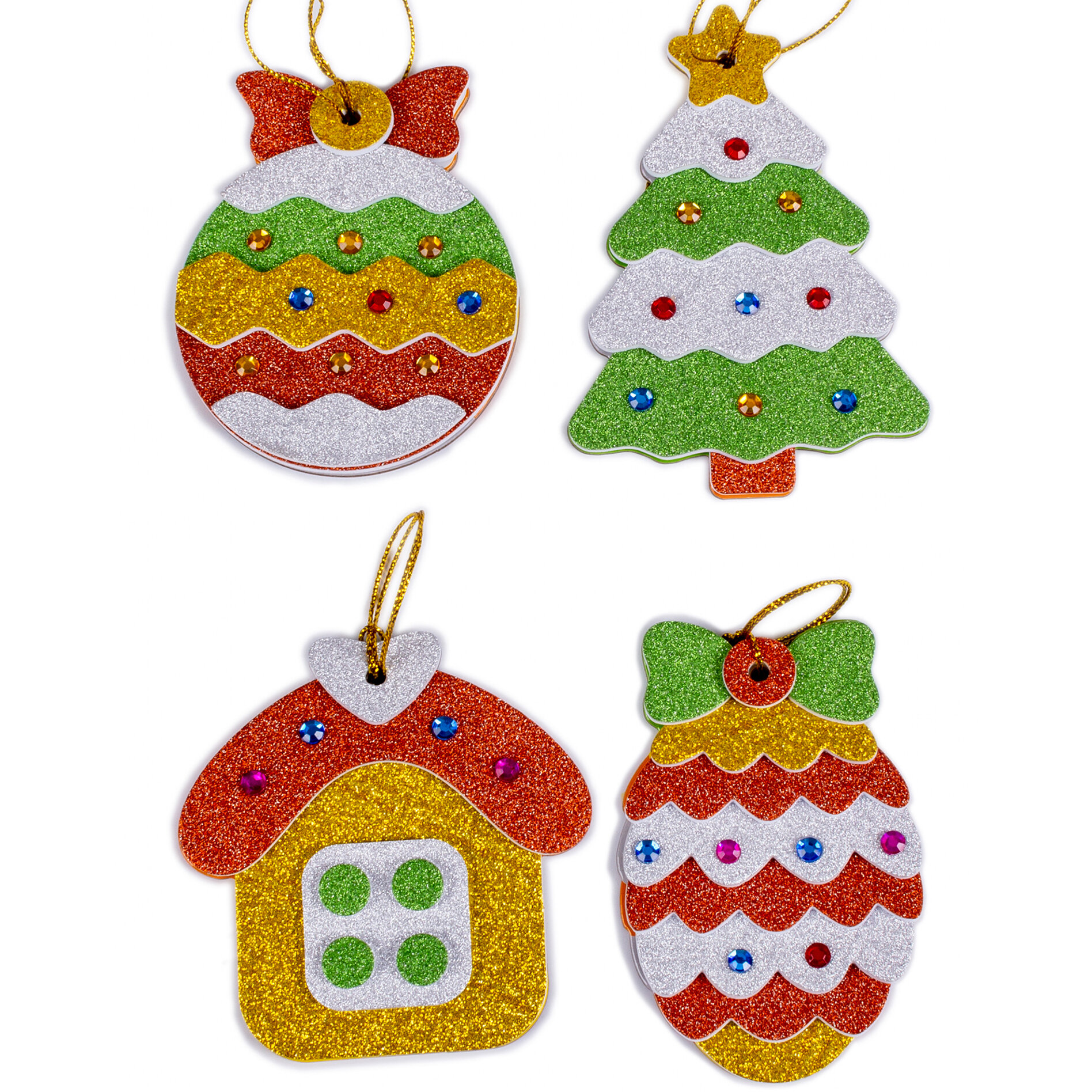 Каждый ребёнок любит наряжать ёлочку, а если игрушки сделаны своими руками - это принесёт ещё больше радости и станет поводом для гордости. Набор для творчества, с помощью которого ребёнок самостоятельно сделает четыре яркие и необычные поделки - игрушки. Фигурки из картона нужно украсить блестящими деталями из мягкого пластика ЭВА и разноцветными стразами. Все детали аппликации уже вырезаны и готовы к работе. Нужно лишь снять с защитного слоя фрагмент и приклеить его в соответствующее место, привязать декоративную нить для подвешивания. Это аппликация из современного объёмного полимерного материала ЭВА - безопасного, экологически чистого, не вызывающего аллергии, простого в использовании и приятного на ощупь. Сделай сам свои ёлочные игрушки! Подходит в качестве тематической поделки или новогоднего подарка в детском саду.