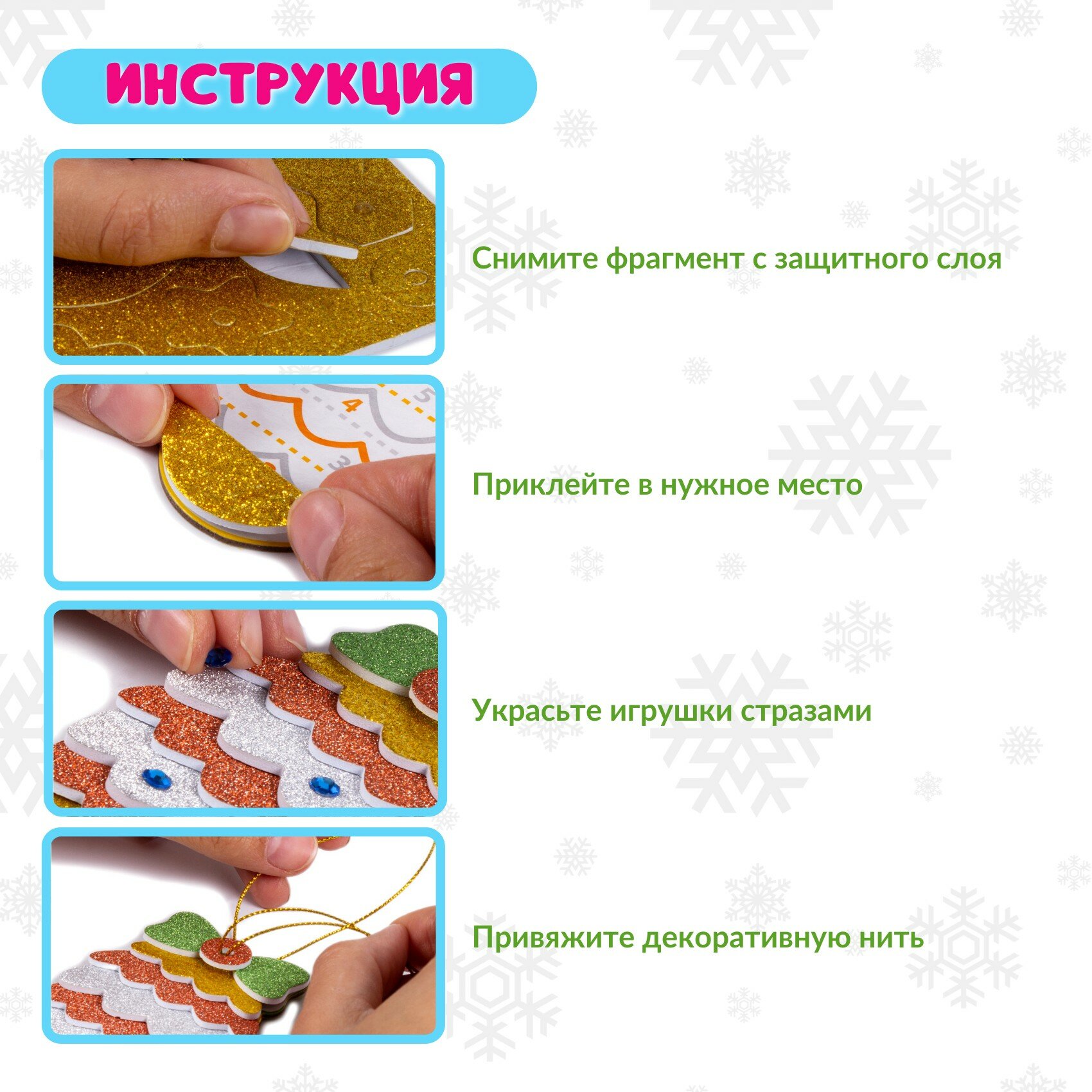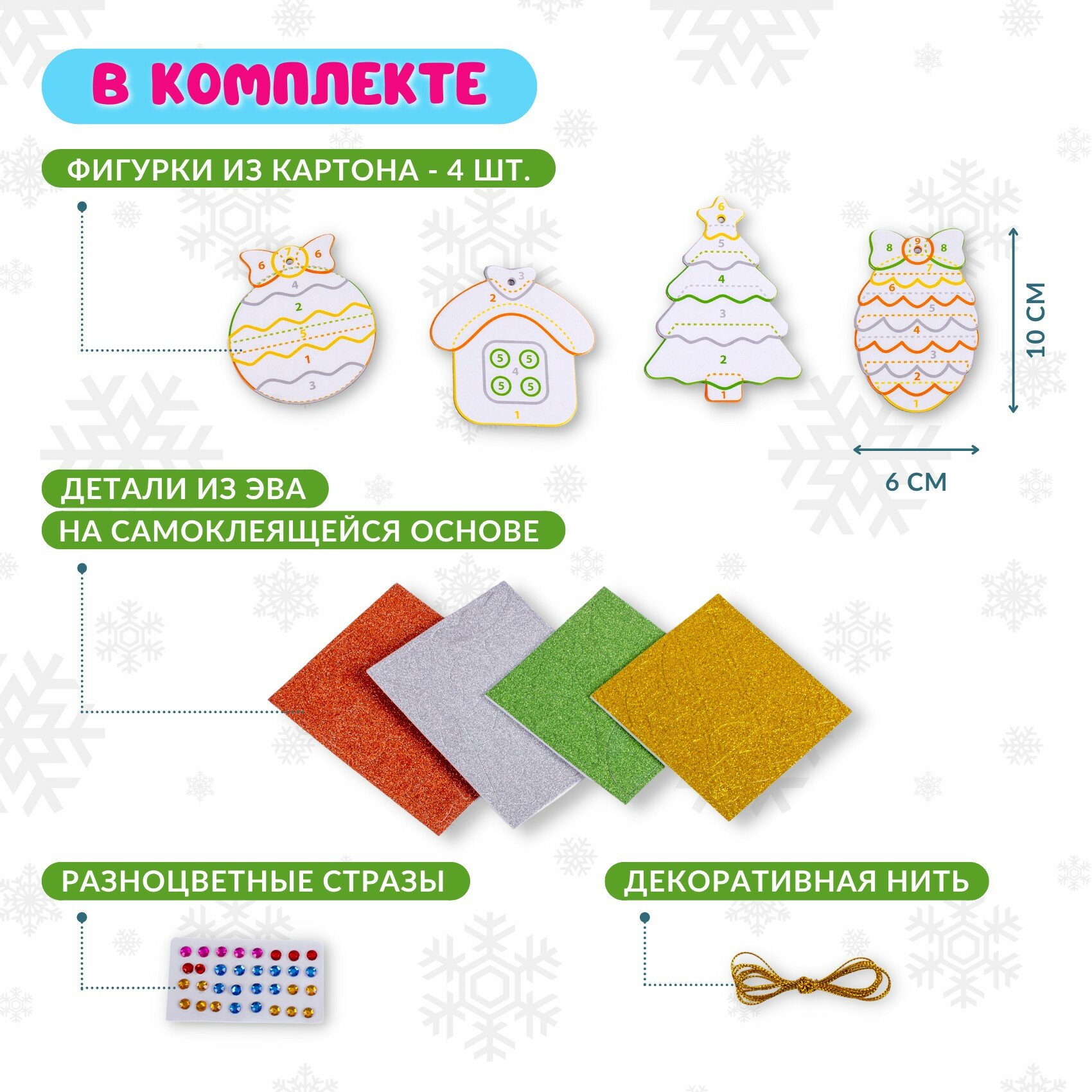 | Состав набора | фигурки из картона - 4 шт, детали из мягкого блестящего пластика ЭВА на самоклеящейся основе - 4 шт, разноцветные стразы - 4 цвета, декоративная нить |