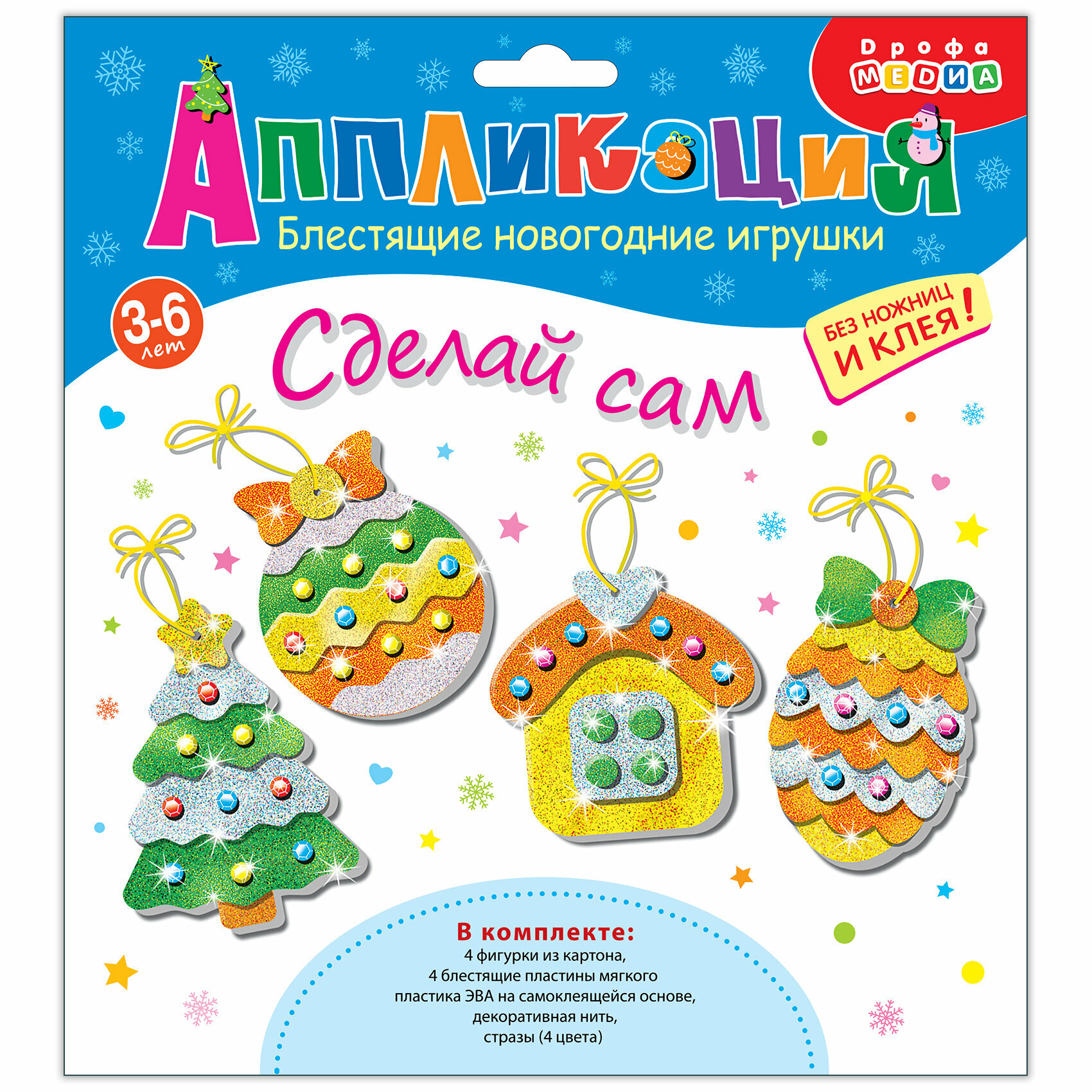 В наборе: 4 фигурки из картона, детали из мягкого блестящего пластика ЭВА на самоклеящейся основе, разноцветные стразы, декоративная нить.