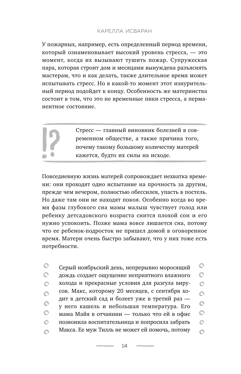 Книгу покупала когда момент материнства двигался к серьезному кризису. Постоянное напряжение и срывы на ребёнка. Не могу сказать что книга стала волшебным инструментом. Для того чтобы это было так нужно работать долго над собой и своими эмоциями. Но в момент ее прочтения я ощущала некое успокоение, и ритм жизнь как будто немного замедлялся. И при помощи ее я осознала одну вещь которая вроде лежала на поверхности, но я ее упорно не замечала и тем самым рушила некоторые аспекты своей жизни. Если вы слишком устали, и совсем перестали контролировать себя прочитайте эту книгу. Даже если не поможет, хуже точно не станет! А может Вам она и поможет!