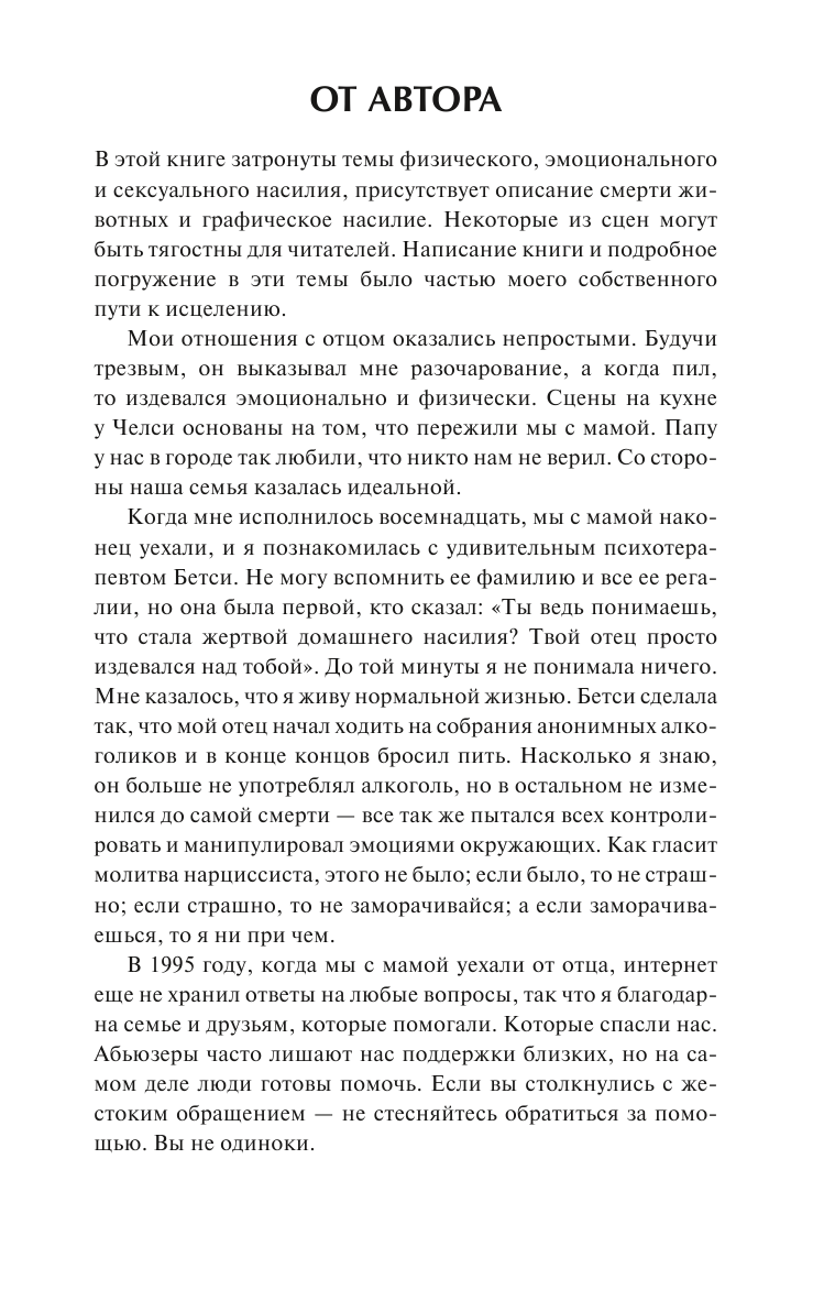 Книгу пока что не читала, но аннотация и первые слова автора - интригующие. "В книге затронуты темы физического, эмоционального и сексуального насилия, присутствует описание смерти животных и графическое насилие". -
