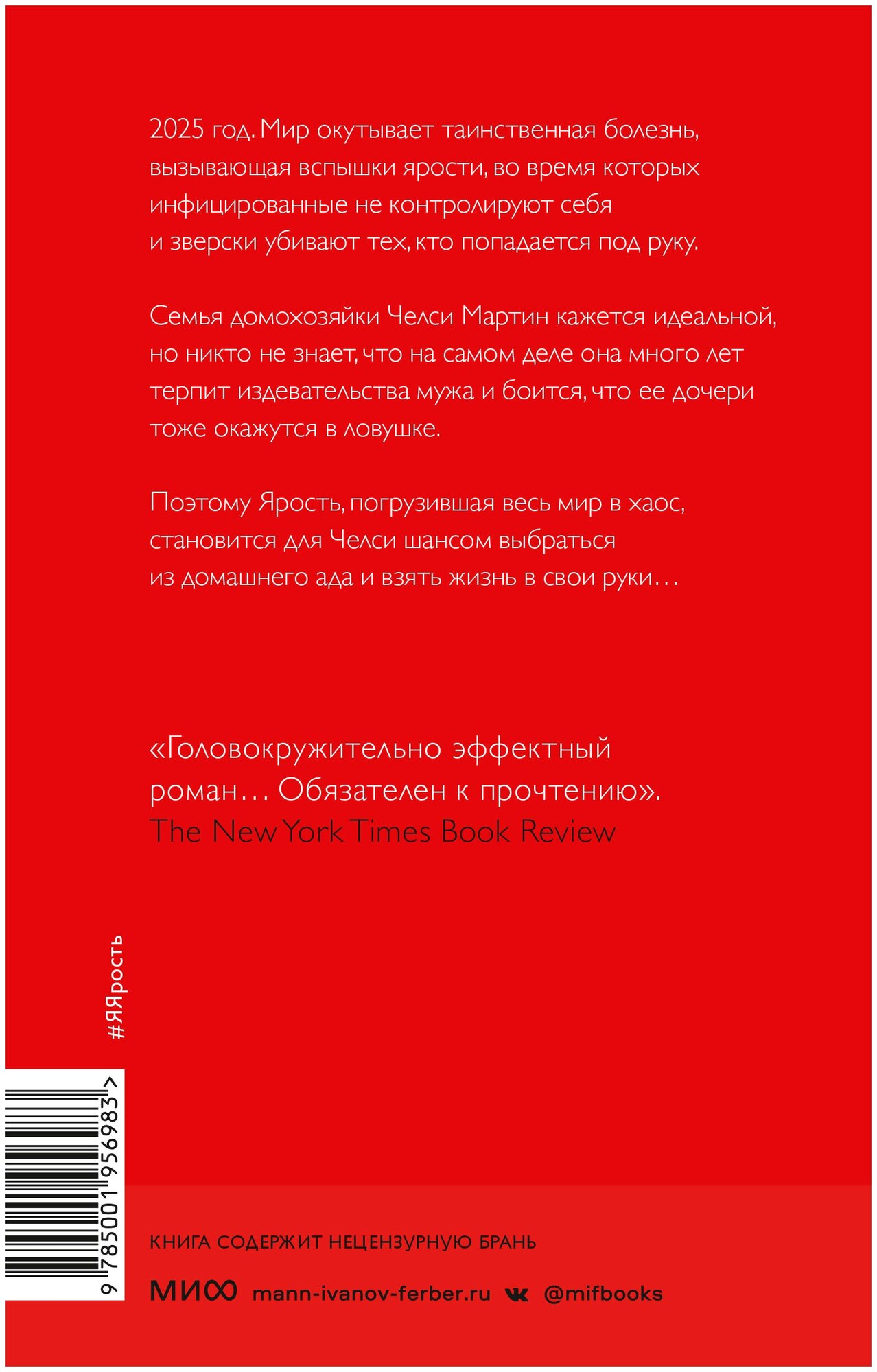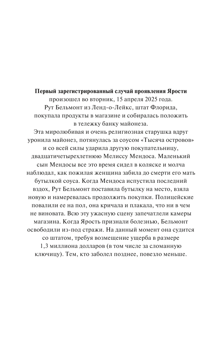 Сюжет интересный, не отпускает до последней строчки. Автор описывает 2025 год, после коронавируса пришла непонятная болезнь, которую назвали "Ярость", люди под вспышками болезни убивают близких, а потом не могут вспомнить, что произошло.