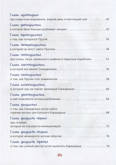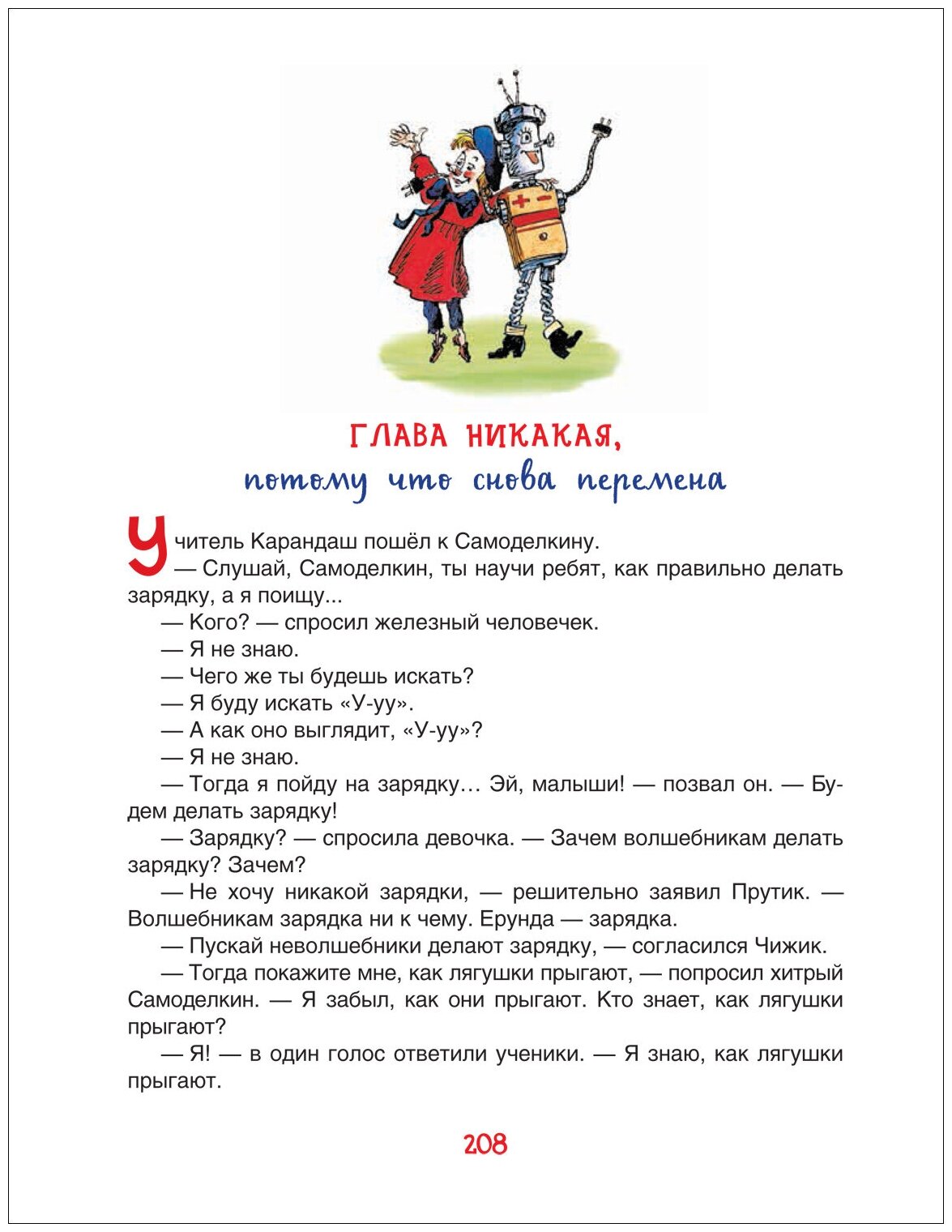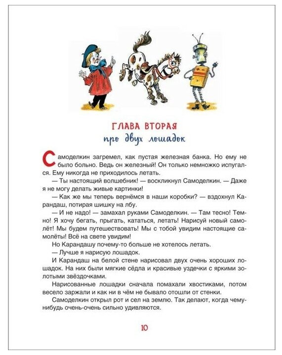 Книга расскажет о приключениях веселых маленьких человечков: художника Карандаша и мастера Самоделкина. Рисунки Карандаша мгновенно оживают, а Самоделкин может смастерить любой, даже самый сложный механизм. В книгу вошли две сказки: «Приключения Карандаша и Самоделкина» и «Волшебная школа Карандаша и Самоделкина». Иллюстрации народного художника РФ Анатолия Елисеева.