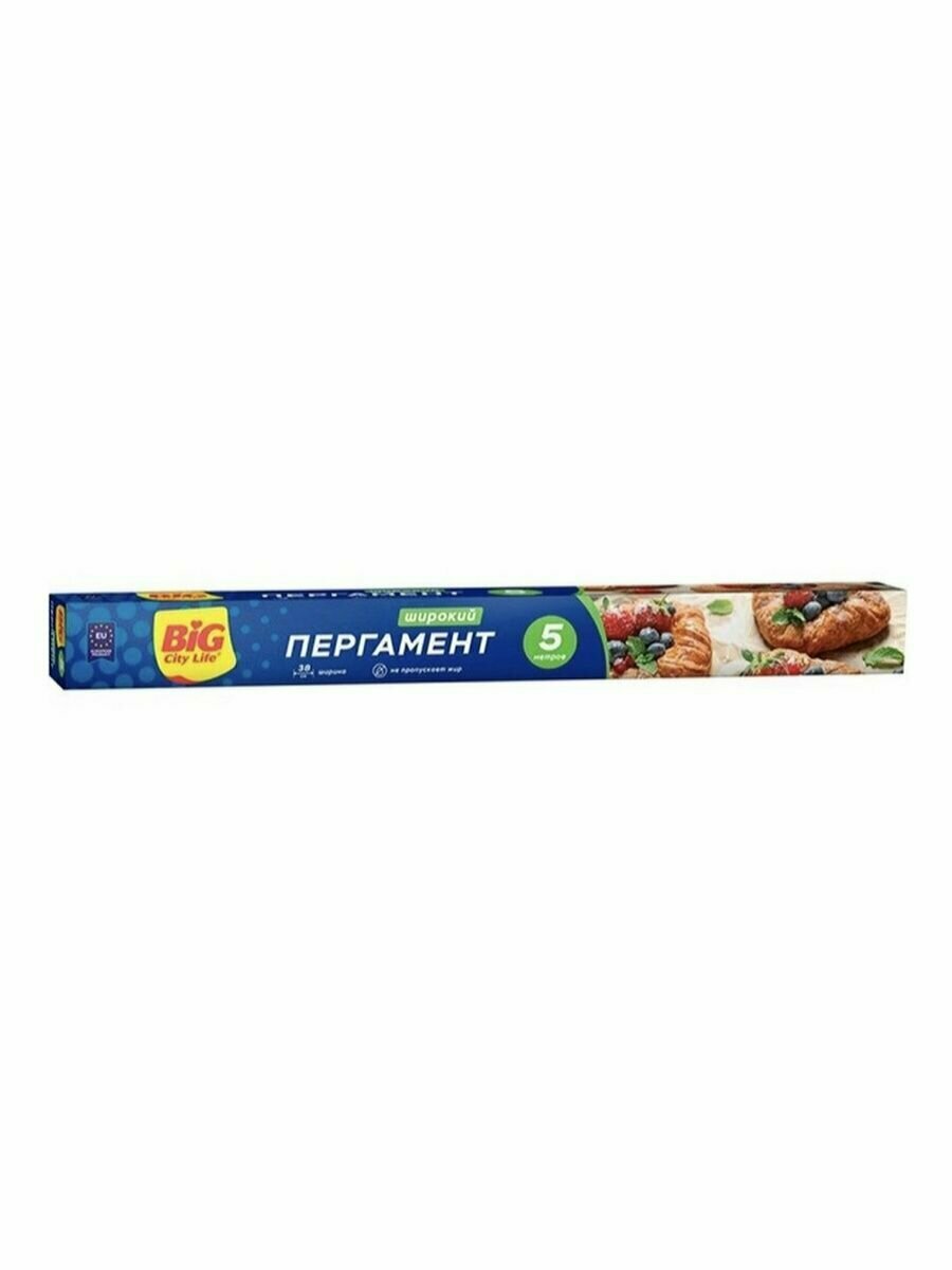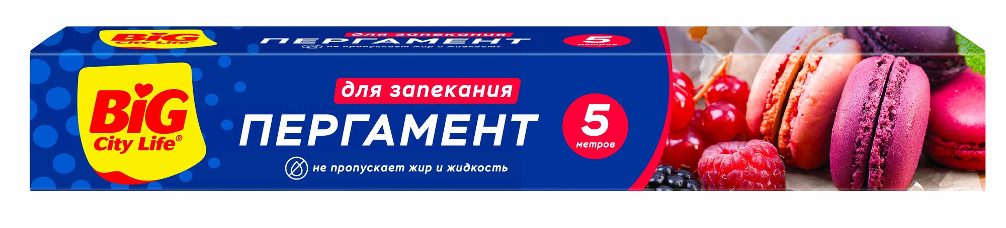 Пергамент для запекания Big City Life широкий, 5 м. Пергамент для запекания широкий Big City Life предназначен для выпекания, приготовления пищи, упаковки и хранения пищевых продуктов. Подходит для приготовления в газовых и электрических духовых шкафах при температуре до 220 С. Двухстороннее силиконовое покрытие пергамента делает его жиронепроницаемым и термостойким. Благодаря своему уникальному антипригарному покрытию пергамент является универсальным. Способы применения: запекать в духовке, варка - аналог пароварки, раскатывать коржи, сервировать стол, хранить продукты (например, сыр), порционно замораживать и даже готовить суши. Широкий рулон подойдет для любых видов противней. Плотность 40 г/м2. Ширина листа увеличена до 38 см, длина намотки 5 метров.