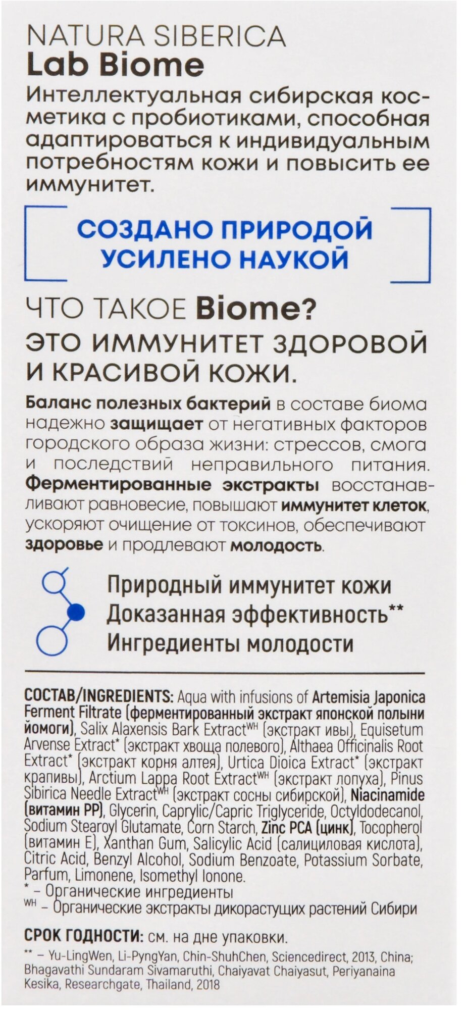 | Состав | aqua with infusions of artemisia japonica ferment filtrate (ферментированный экстркат японской полыни йомоги), salix alaxensis bark extractwh (экстракт ивы), equisetum arvense extract* (экстракт хвоща полевого), althaea officinalis root extract* (экстракт корня алтея), urtica dioica extract* (экстракт крапивы), arctium lappa root extractwh (экстракт лопуха), pinus sibirica needle extractwh (экстракт сосны сибирской), niacinamide (витамин рр), glycerin, caprylic/capric triglyceride, octyldodecanol, sodium stearoyl glutamate, corn starch, zinc pca (цинк), tocopherol (витамин е), xantan gum, salicylic acid (салициловая кислота), citric acid, benzyl alcohol, sodium benzoate, potassium sorbate, parfum, limonene, isomethyl ionone. * - органические ингредиенты wh - органические экстракты дикорастущих растений сибири |