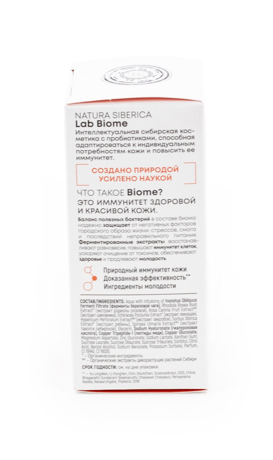 Состав: aqua with infusions of inonotus obliquus ferment filtrate (ферменты березовой чаги), rhodiola rosea root extract* (экстракт родиолы розовой), rosa canina fruit extract wh (экстракт шиповника), echinacea purpurea extract* (экстракт эхинацеи), hypericum perforatum extract WH (экстракт зверобоя), sorbus sibirica extract* (экстракт рябины), spiraea ulmaria extract WH (экстракт таволги сибирской), glycerin, sodium hyaluronate (гиалуроновая кислота), copper tripeptide-1( пептиды меди), copper gluconate (глюконат меди), magnesium aspartate, zinc gluconate, sodium lactate, xanthan gum, sucrose laurate, sucrose dilaurate, sucrose trilaurate, sorbitol, citric acid, benzyl alcohol, sodium benzoate, potassium sorbate, parfum, ci 19140, ci 16035