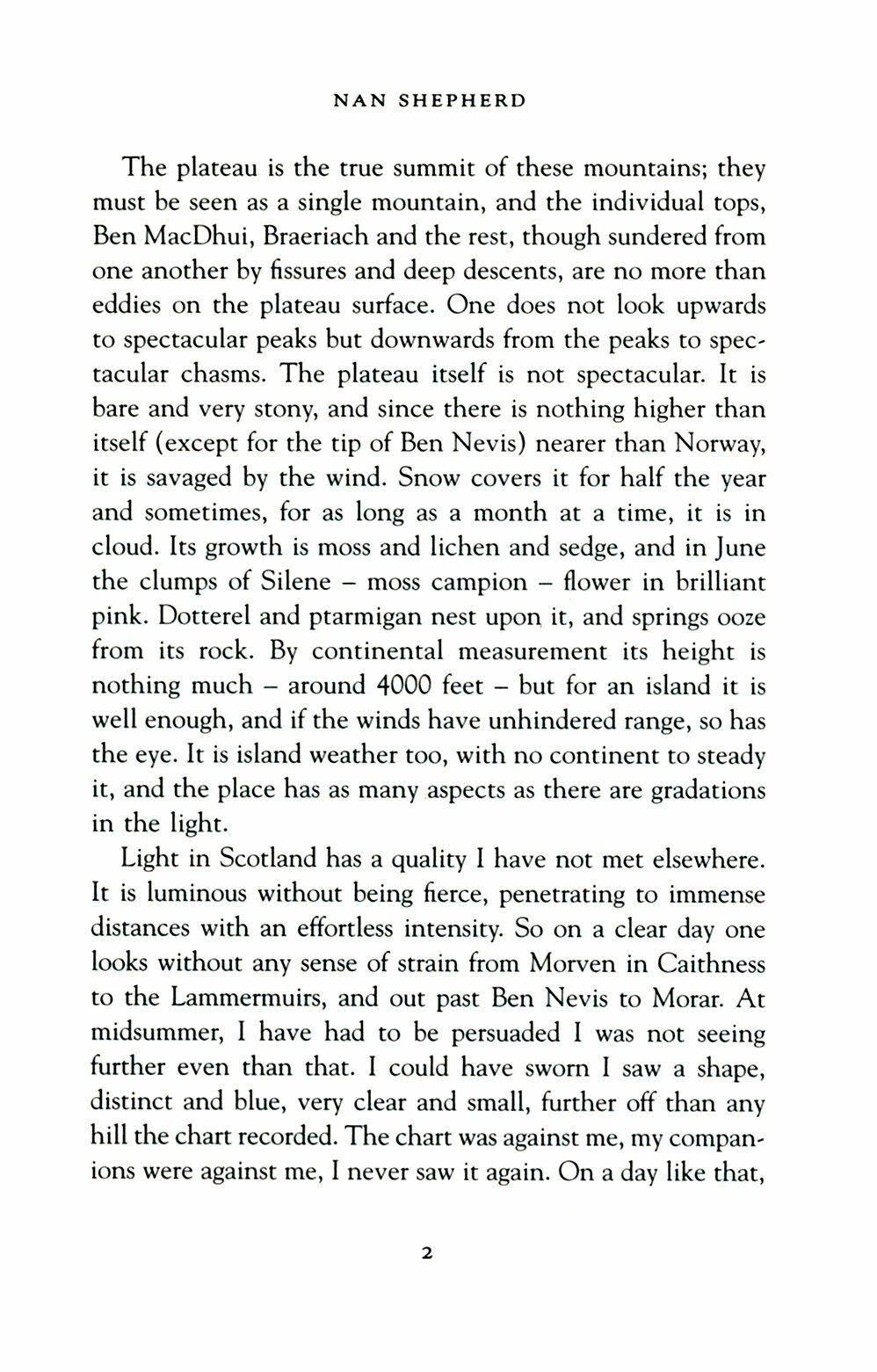 'The finest book ever written on nature and landscape in Britain' Guardian Introduction by Robert Macfarlane. Afterword by Jeanette Winterson In this masterpiece of nature writing, Nan Shepherd describes her journeys into the Cairngorm mountains of Scotland. There she encounters a world that can be breathtakingly beautiful at times and shockingly harsh at others. Her intense, poetic prose explores and records the rocks, rivers, creatures and hidden aspects of this remarkable landscape. Shepherd spent a lifetime in search of the 'essential nature' of the Cairngorms;