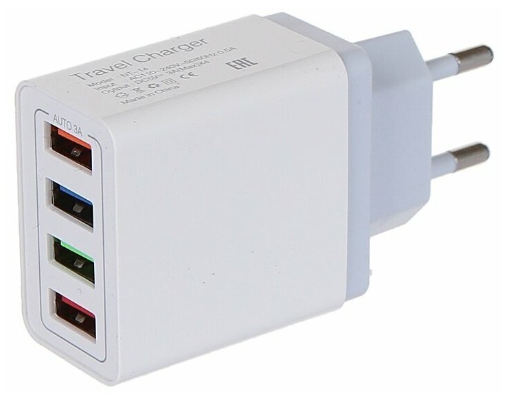 Сетевое зарядное устройство NT-14 предназначено для зарядки различных мобильных гаджетов от электросети 110-240 В. Благодаря наличию 4-х портов USB Type-A возможна одновременная зарядка до четырех устройств. Максимальный ток заряда на всех портах 3 А. Выходное напряжение 5 В. Корпус изготовлен из пластика.