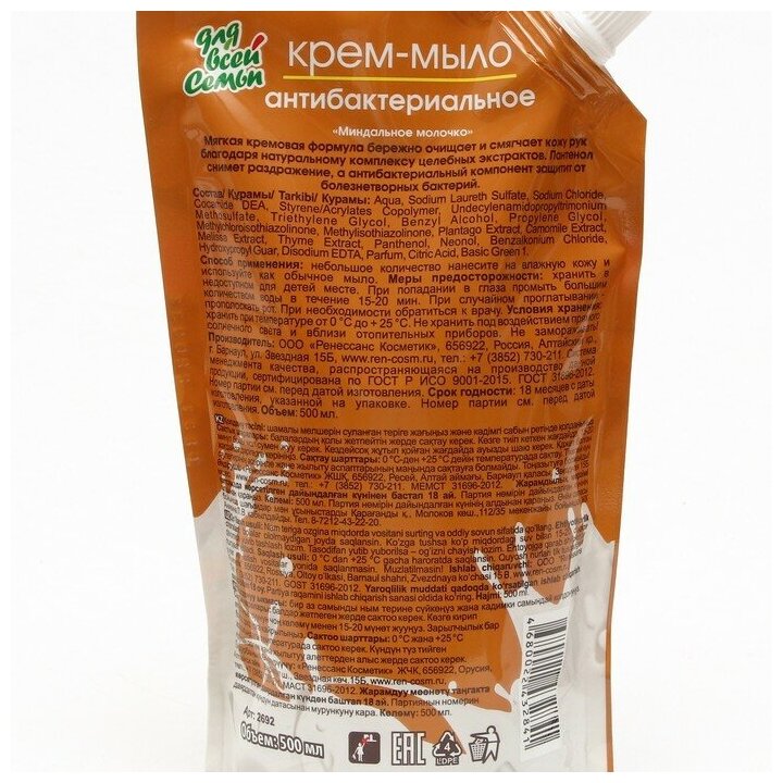 мыло жидкое ДЛЯ ВСЕЙ СЕМЬИ Миндальное молочко антибактериальное 500мл дой-пак