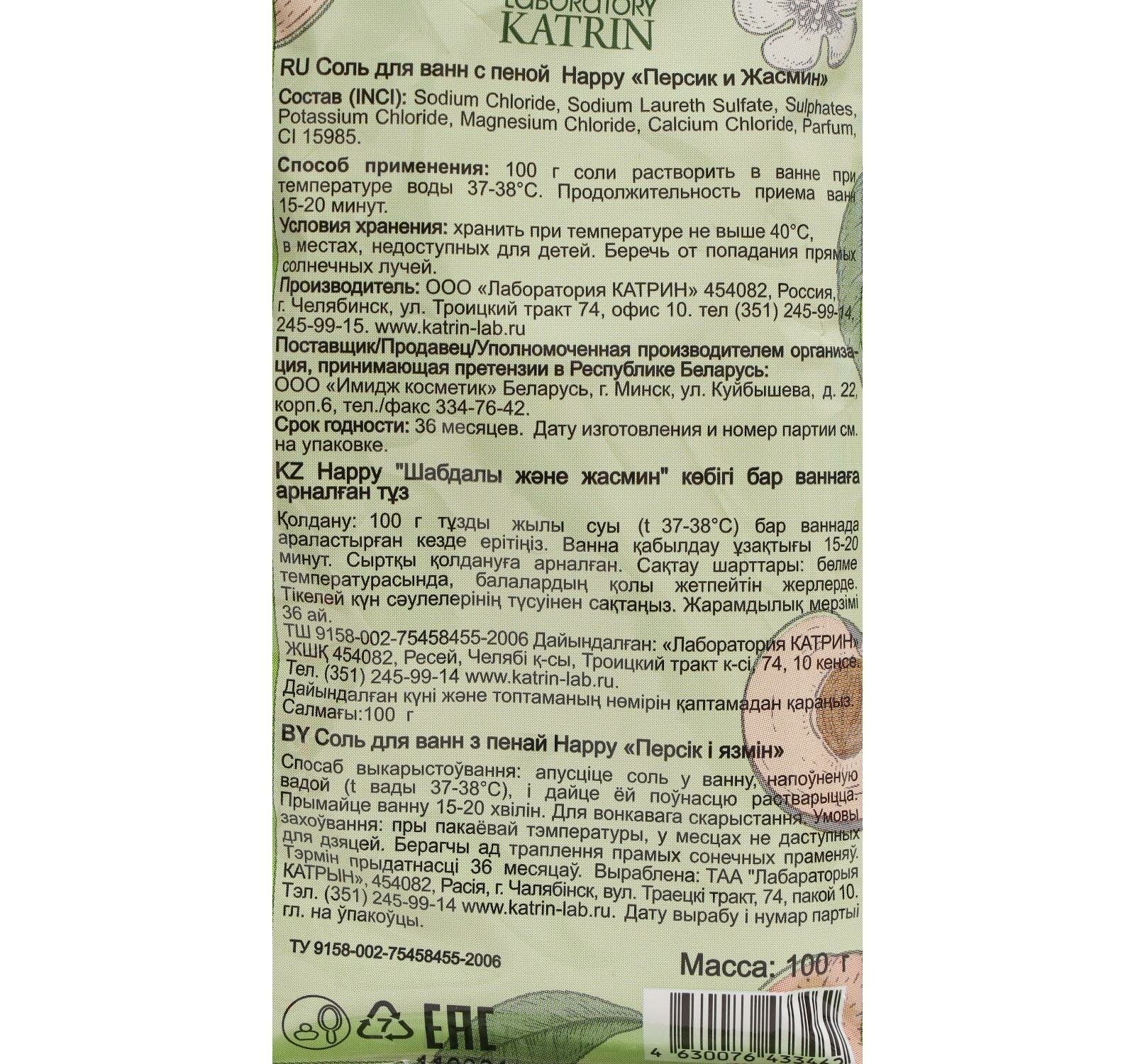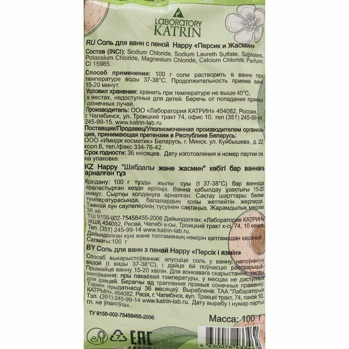 | Полное наименование | Соль для ванн Laboratory Katrin Happy Jasmine & Peach с пеной 100 г |