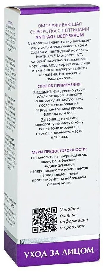 Омолаживающая сыворотка с пептидами значительно повышает упругость и эластичность кожи. Содержит пептидный комплекс MATRIXYL Morphomics, который заметно разглаживает морщины, моделирует овал лица и активно стимулирует синтез коллагена. Интенсивно омолаживает. Способ применения: 1 вариант: ежедневно утром и/или вечером нанесите сыворотку на чистую кожу после тонизирования, перед нанесением крема, флюида или геля. 2 вариант: нанесите сыворотку на чистую кожу после тонизирования, перед нанесением маски для лица. 3 вариант: смешайте несколько капель сыворотки с любимым уходовым средством (кремом, флюидом, гелем или маской), чтобы усилить его омолаживающие свойства.