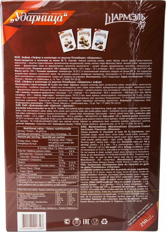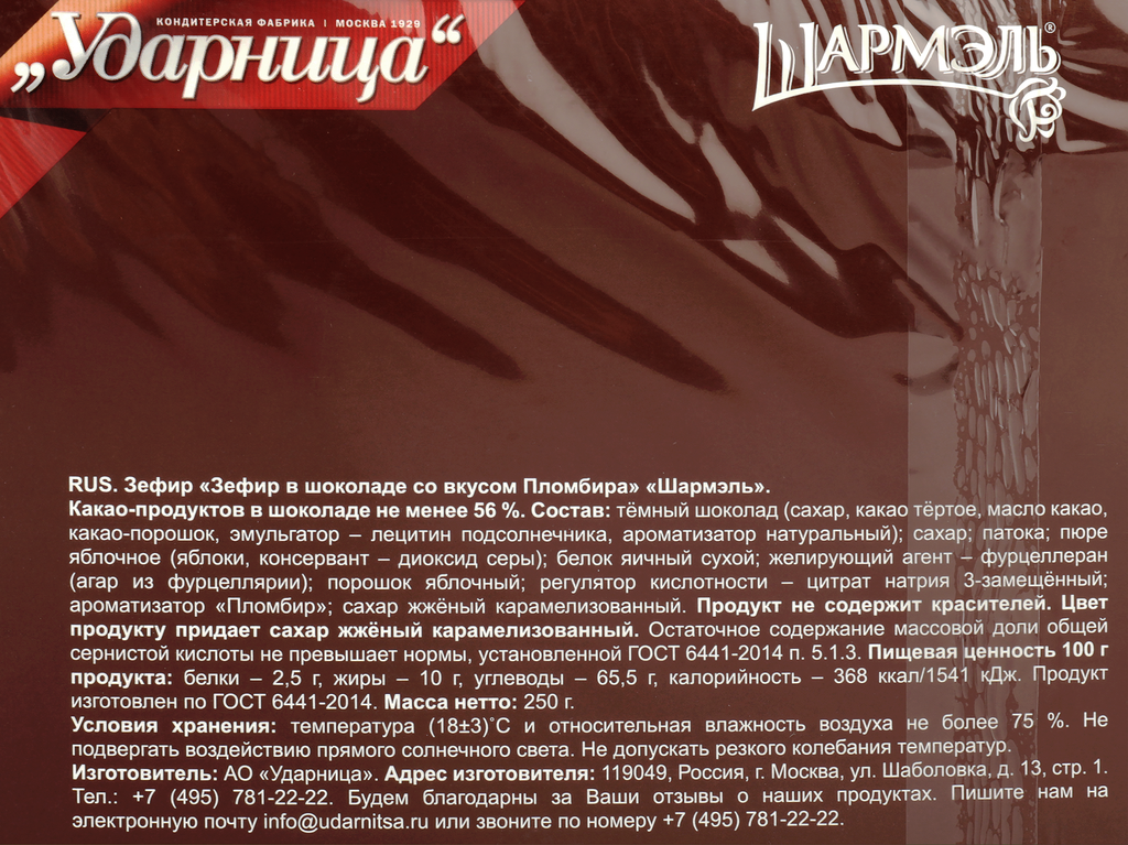 Изысканное лакомство из нежнейшего зефира покрытого настоящим темным шоколадом было впервые создано на фабрике Ударница. Более полувека кондитеры фабрики бережно хранят секрет необычайного вкуса зефира в шоколаде, знакомого многим с детства.