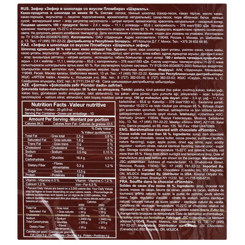 | Состав | темный шоколад (сахар, какао тертое, масло какао, какао порошок, эмульгатор - лецитин подсолнечника, ароматизатор натуральный), сахар, патока, пюре яблочное, белок яичный сухой, желирующий агент - фурцеллярин (агар из фурцеллярии), регулятор кислотности - цитрат натрия, ароматизатор, краситель натуральный - сахарный коллер iii |