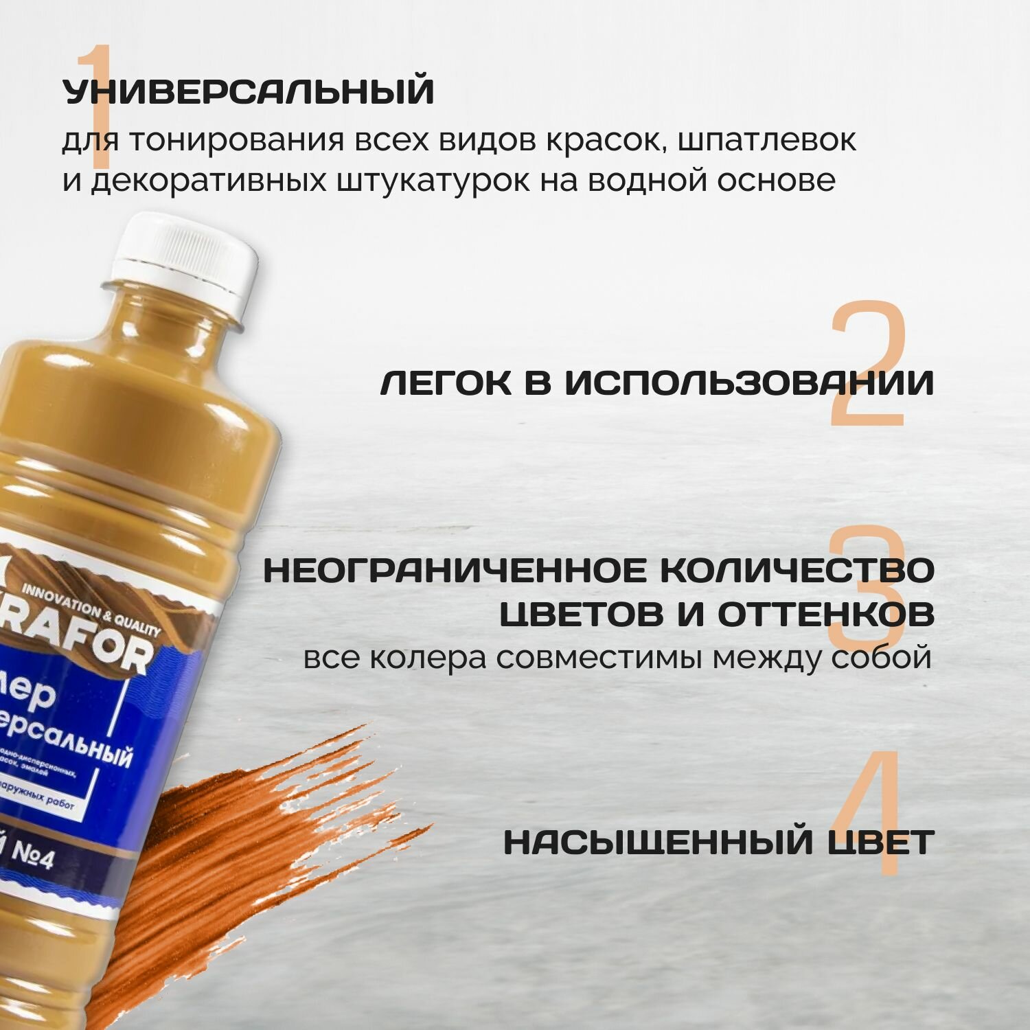 Универсальный колер предназначен для колеровки эмалей, водно-дисперсионных и масляных красок, сухих строительных смесей. Широкая цветовая гамма. Может применяться как внутри, так и снаружи помещений. Универсальный колер выпускается в 22 основных цветах. На практике можно получить неограниченное количество цветов и оттенков, так как все колера совместимы между собой. Материал легок в использовании. Колер предназначен для колеровки эмалей, водно-дисперсионных и масляных красок, сухих строительных смесей, растворов, побелочных и других составов.