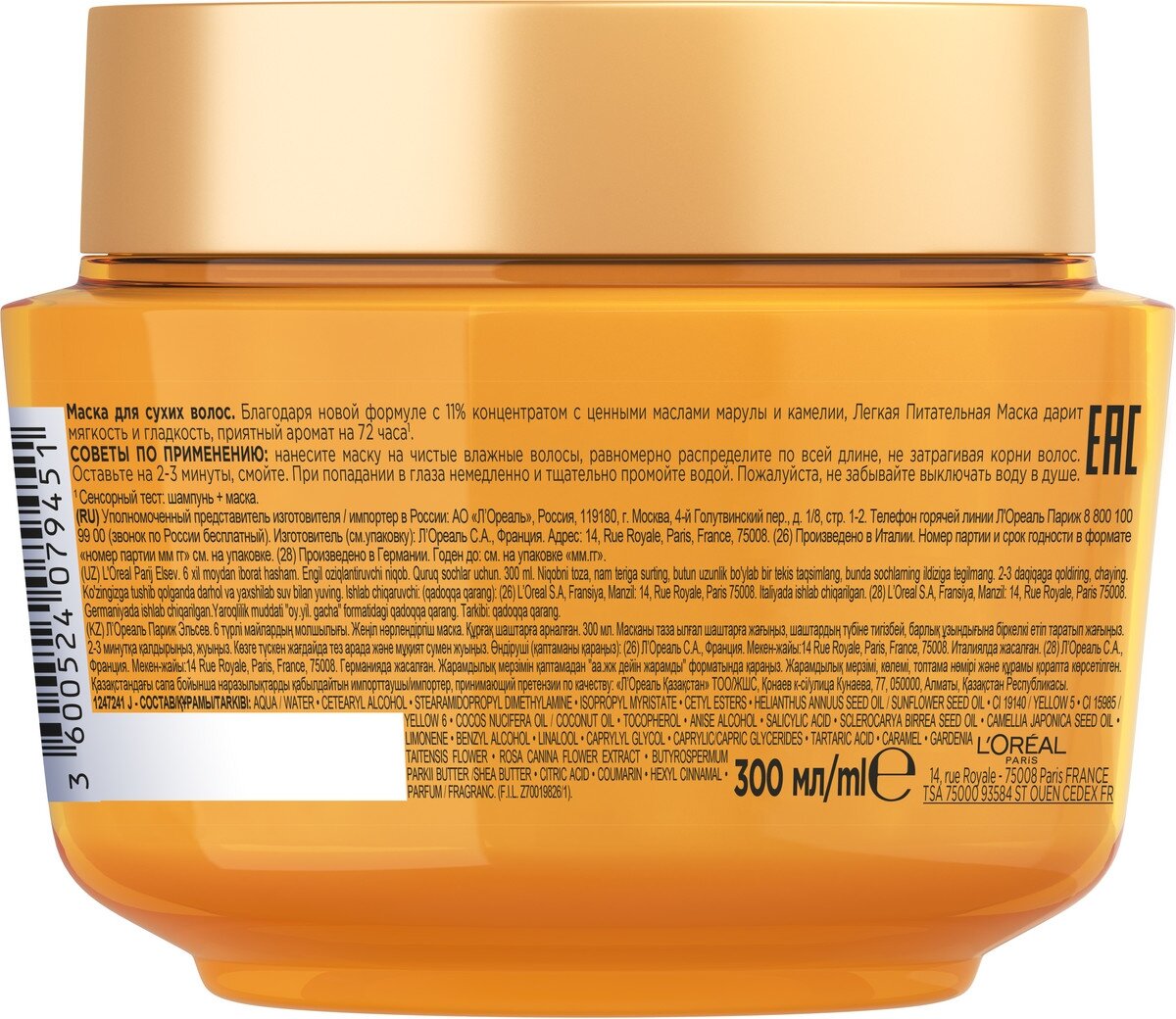 Благодаря своей роскошной тающей текстуре и формуле, обогащенной уникальным эликсиром из 6 микро-масел редких цветов, маска интенсивно питает волосы по всей длине без утяжеления Равномерно нанесите на всю длину чистых отжатых волос, уделив внимание кончикам. Оставьте на 2-3 минуты, затем смойте. При попадании в глаза немедленно промойте водой.