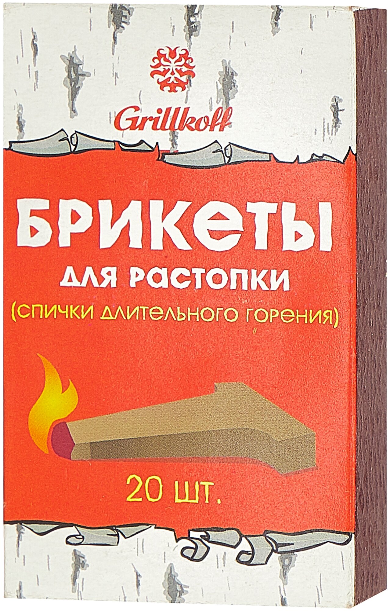 Брикеты для растопки (спички длительного горения) - представляют собой спрессованную смесь древесной пыли и твердого парафина, дополнительно снабжены серным наконечником. На упаковке находится серная зажигательная полоса. Продолжительность горения одного брикета - не менее 15 минут. Основное преимущество - небольшой объём, малый вес, удобство в транспортировке, безопасность, экономичность. В коробке - 20 шт.