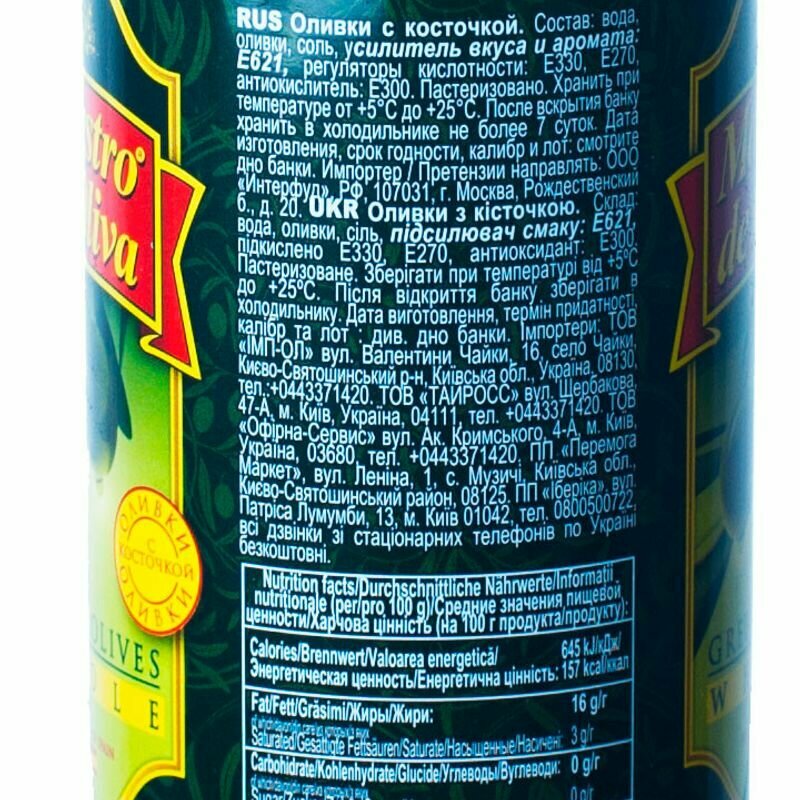 | Состав | оливки, вода, соль, усилитель вкуса и аромата |