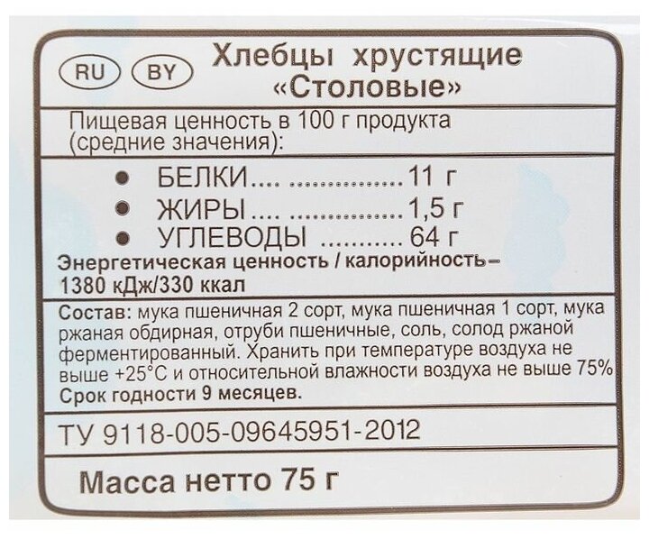 | Состав | мука пшеничная 2 сорт, мука пшеничная 1 сорт, мука ржаная обдирная, отруби пшеничные, вода питьевая, соль, солод ржаной ферментированный |