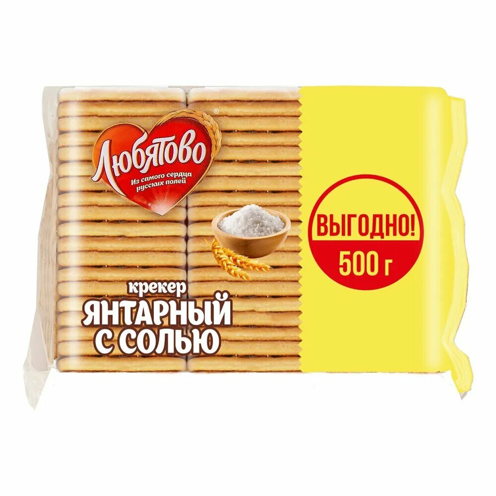 Классический соленый крекер золотистого цвета Любятово "Янтарный с солью" подойдет как для завтрака, так и для чаепития в любое время дня.