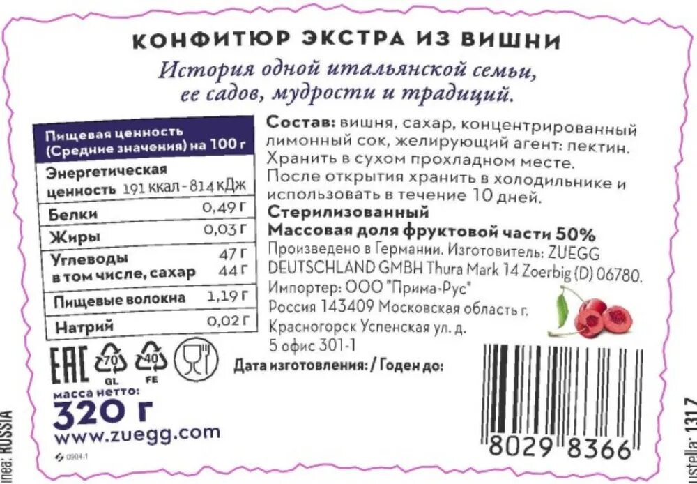 | Состав | вишня, сахар, лимонный сок, желеобразователь |