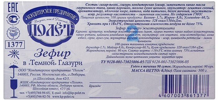 Зефир «Полёт» в глазури из темного шоколада 500 г Полет