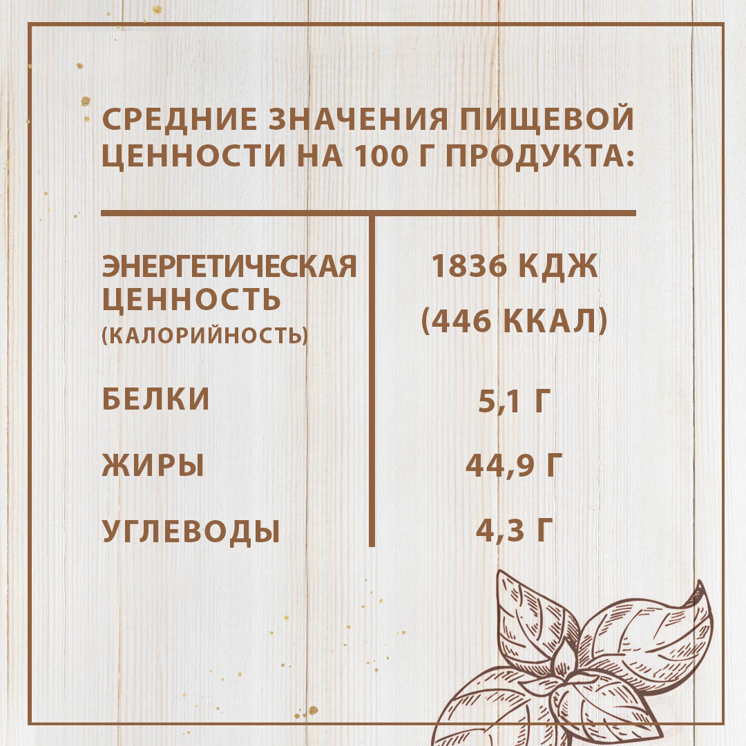 | Состав | Масло подсолнечное рафинированное дезодорированное 40 %, базилик 33 %, сыр Grada Padano PDO (коровье молоко, яичный лизоцин) 6,3 %, ядро ореха кешью, соль, сыр Pecorino Romano PDO (из овечьего молока) 2 %, сахар, картофельные хлопья, кедровые орехи, чеснок 0,9 %, регулятор кислотности: молочная кислота. |