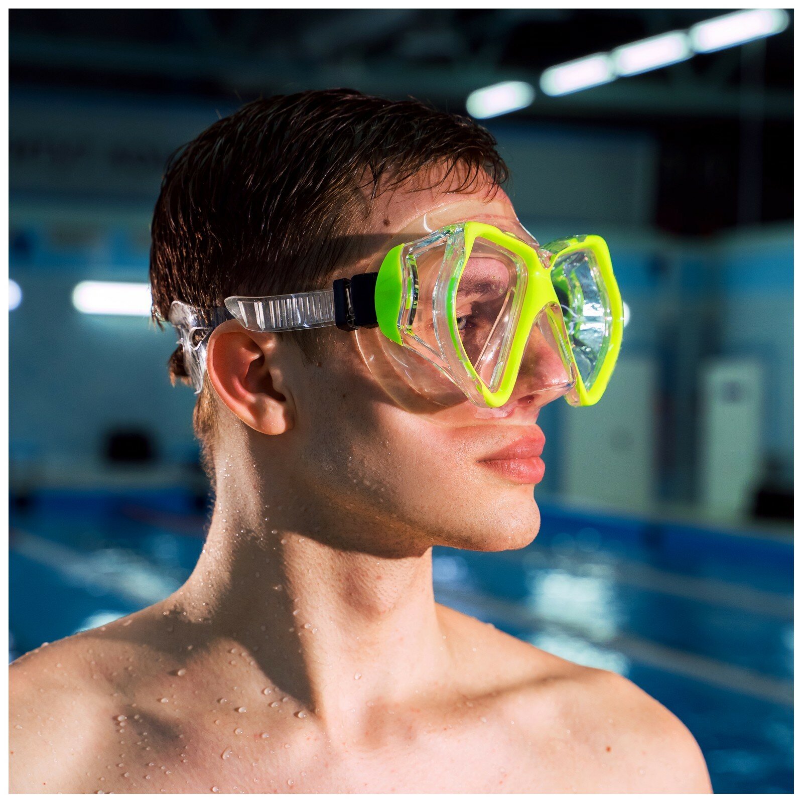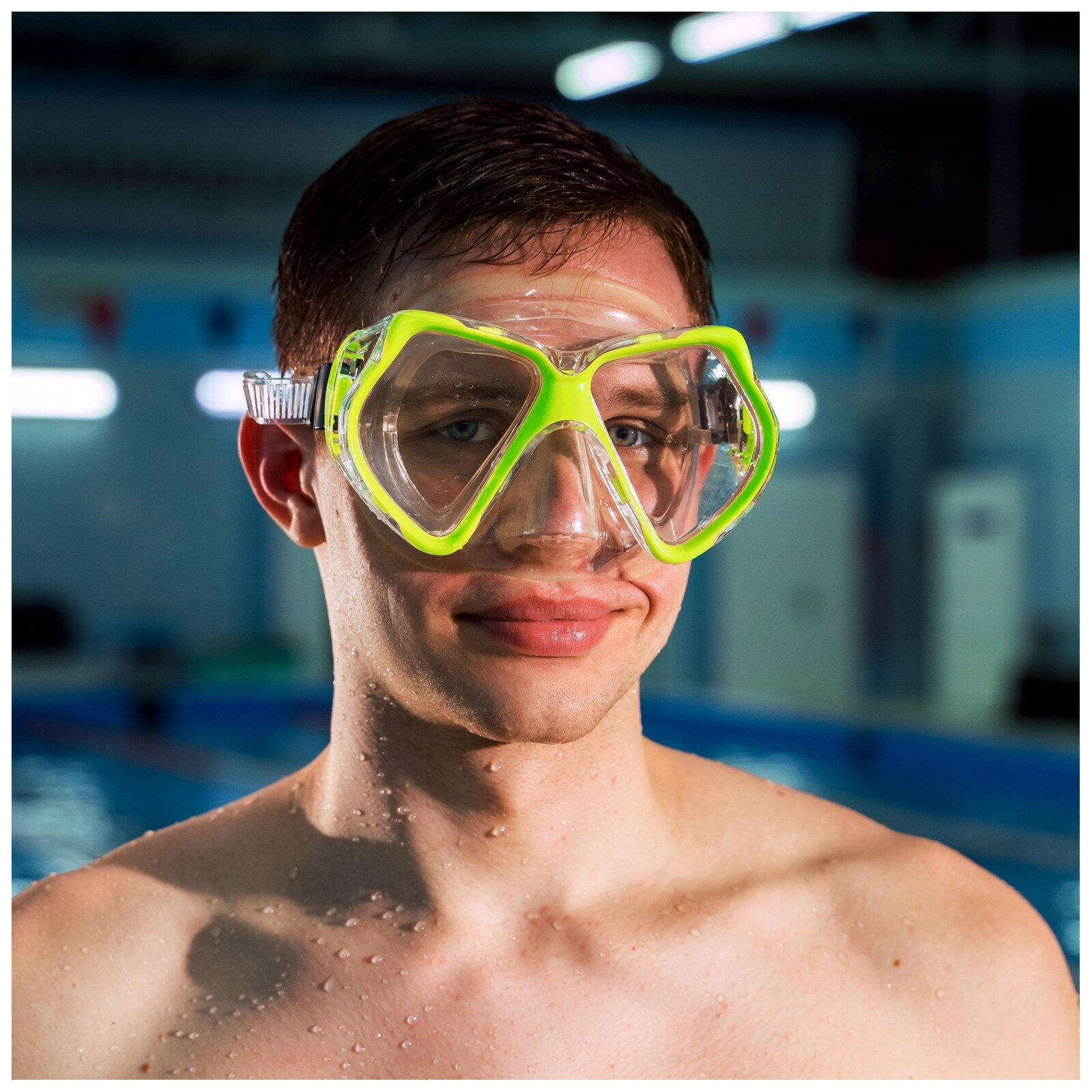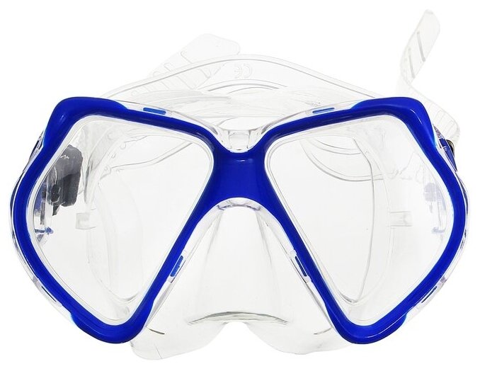 Маска для плавания позволяет находиться под водой с открытыми глазами, а также не даёт воде попасть в нос. Маска плотно прилегает и предотвращает протечки; ремешок регулируется.