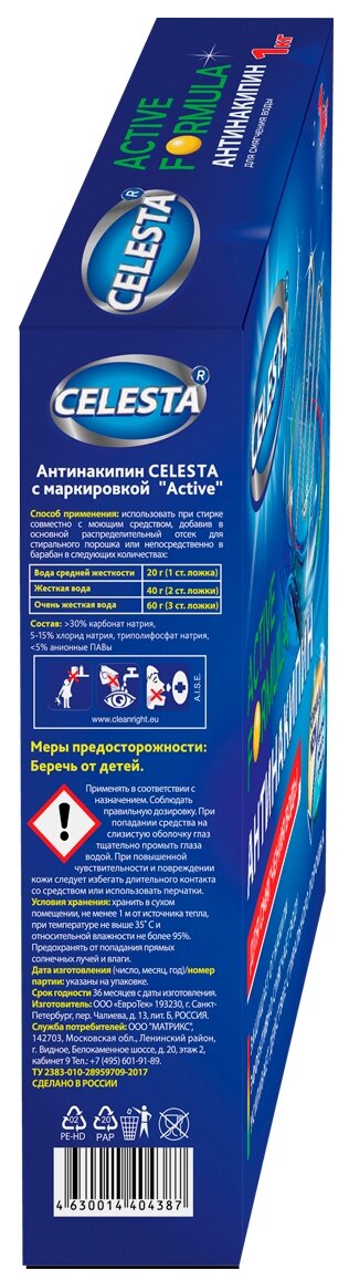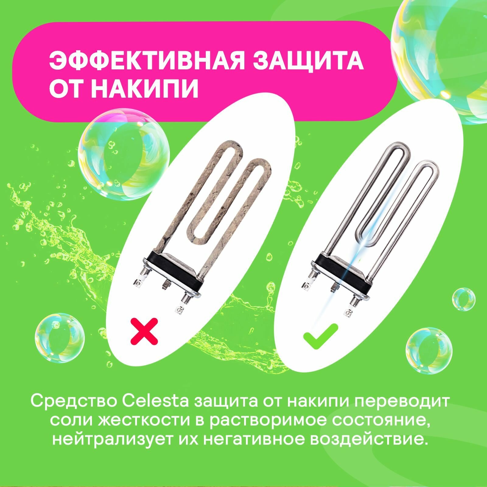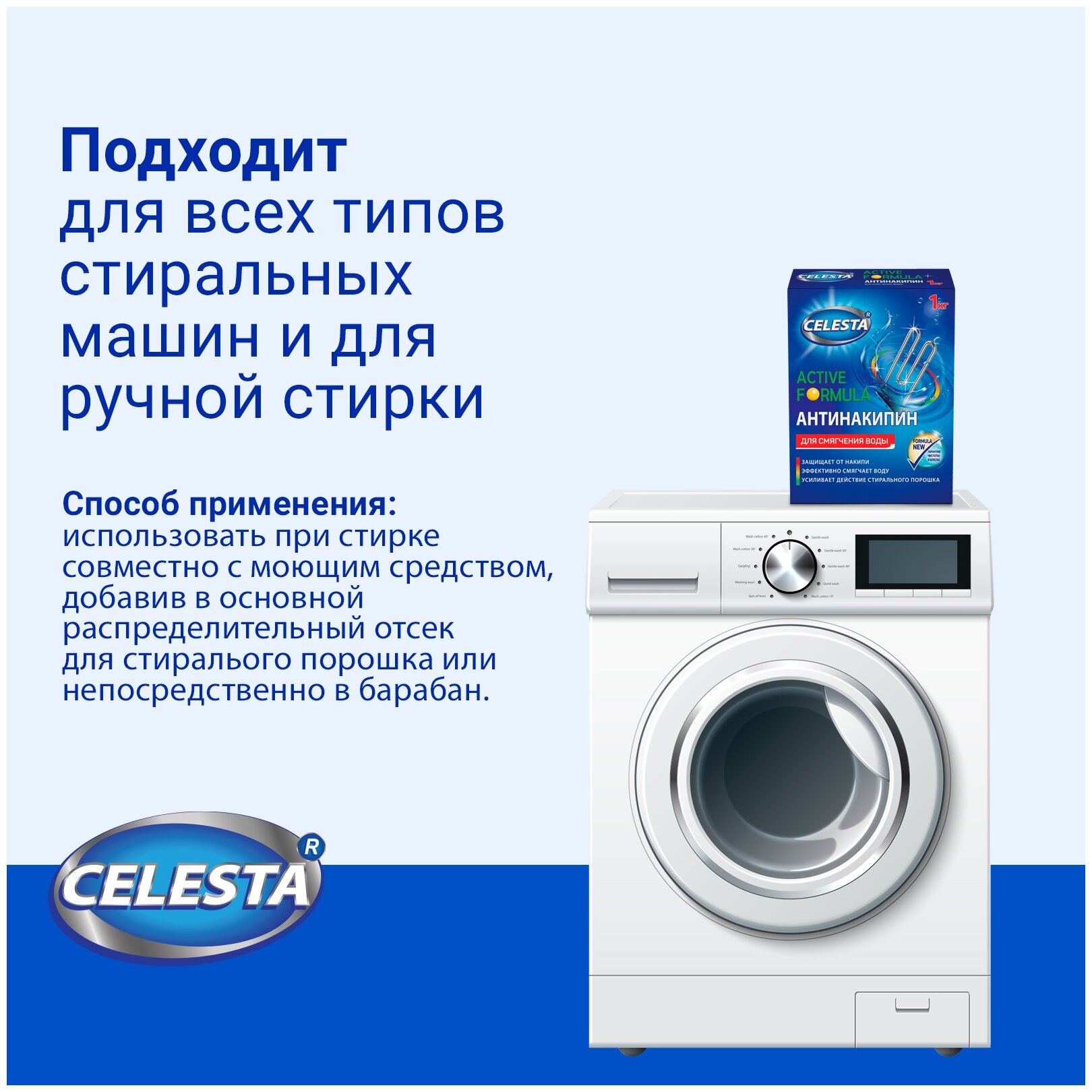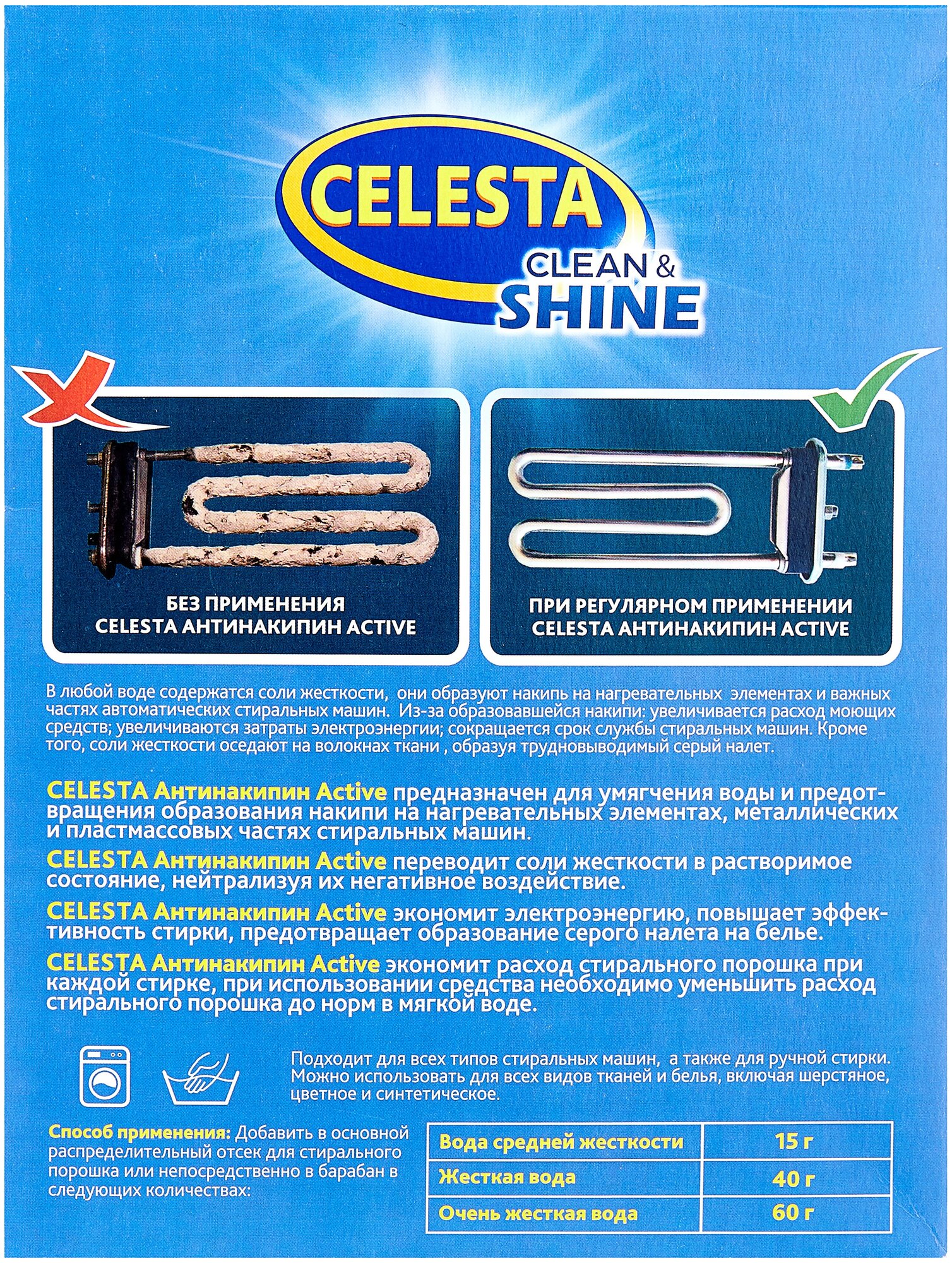 Антинакипин Celesta Active предназначен для умягчения воды и предотвращения образования накипи на нагревательных элементах, металлических и пластмассовых частях стиральных машин, переводит соли жесткости в растворимое состояние, экономит электроэнергию, повышает эффективность стирки, предотвращает образование серого налета на белье, уменьшает расход стирального порошка. Применяется при стирке белья.