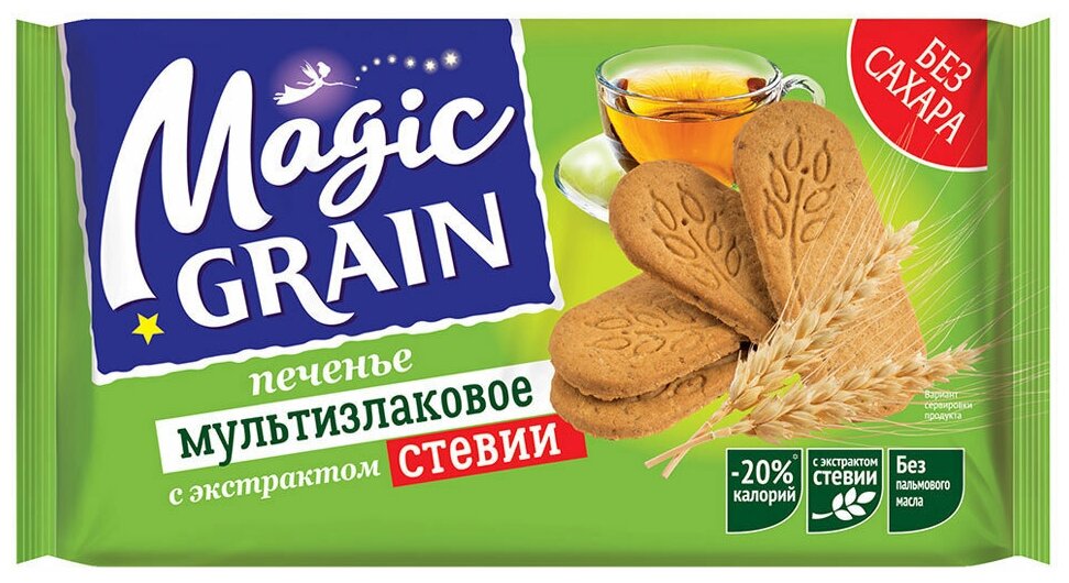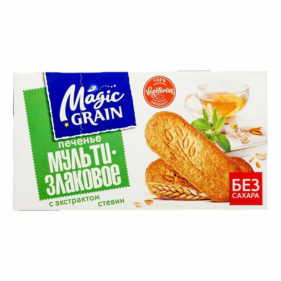 Печенье мультизлаковое с экстрактом стевии «Magic Grain» отличается сниженной калорийностью, производится без пальмового масла и сахара.