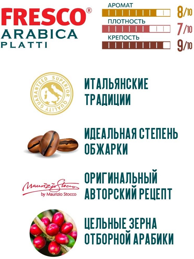 Все здесь — от пирожных и шоколадных конфет до аперитивов и кофе — готовится по старинным, бережно сохраняемым рецептам, которые с течением времени впитали в себя весь колорит итальянской жизни — безмятежной и импульсивной, традиционной и новаторской. С первого глотка Fresco Platti вас окутает вдохновляющий аромат и откроются грани яркого, насыщенного вкуса с теплыми нотками шоколада. Это настоящий шедевр кофейного искусства, прикоснуться к которому захочется вновь и вновь. Эксклюзивная авторская линия сортов Fresco Superior Quality, включающая Fresco Arabica Solo, Fresco Arabica Blend, Fresco Arabica Doppio, Fresco Platti, Fresco Verona разработана в сотрудничестве с одним из самых авторитетных кофейных сомелье Италии - Маурицио Стокко, живущим и работающим в Триесте. Эти кофейные шедевры являются результатом страсти и мастерства Маурицио Стокко, его дара комбинировать, смешивать и находить тонкие сочетания параметров обжарки зерен арабики, создавая уникальные кофейные вкусы.