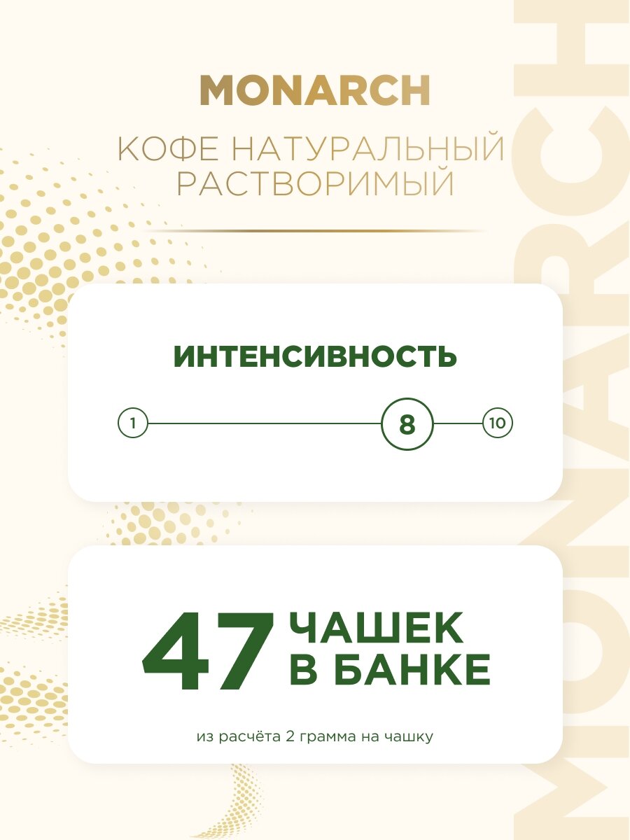 Кофе Jacobs Monarch Intense - натуральный растворимый кофе с интенсивным вкусом. Он создан для тех, кто предпочитает покрепче. Для его изготовления использовались тщательно отобранные кофейные зерна. Они прошли особую обработку, позволившую сохранить.