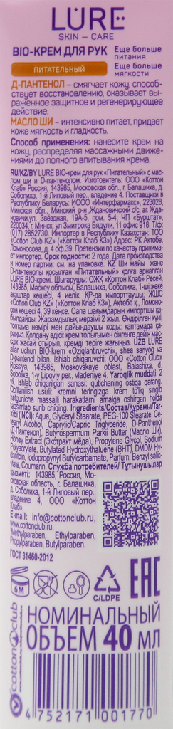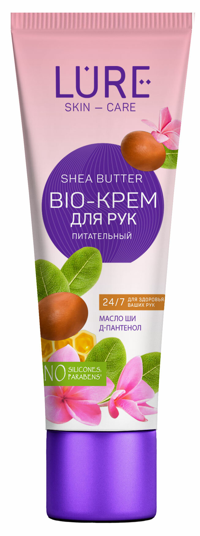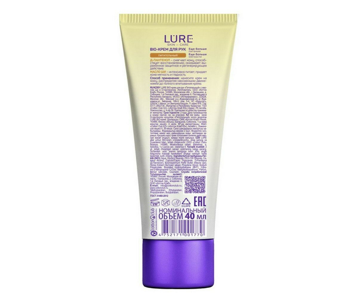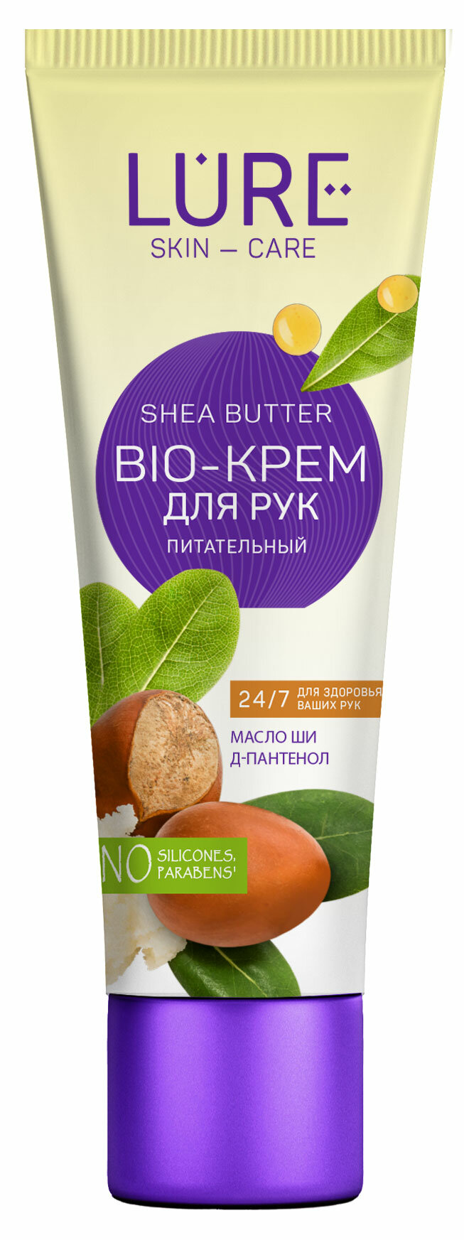 Крем для рук LURE BIO Питательный с маслом ши и D пантенолом 40млКрем для рук Lure Bio питательный с маслом ши и D-пантенолом, 40 мл. Удобный мини-формат. Идеальный помощник в ежедневном уходе и питании кожи рук. 24/7 для здоровья ваших рук Bio-крем для рук Lure с маслом ши и D-пантенолом - незаменимый помощник в уходе за самой капризной кожей рук. Благодаря специальной формуле крем глубоко питает кожу, создавая эффект мягкости и бархатистости. Масло ши делает кожу мягкой и нежной. D-пантенол смягчает кожу, устраняет сухость. Способ применения: легкими массажными движениями нанести небольшое количество крема на сухую чистую кожу рук. Состав: Aqua, Glyceryl Stearate, PEG-100 Stearate, Cetearyl Alcohol, Caprylic/Capric Triglyceride, D-Panthenol (Д-Пантенол), Butyrospermum Parkii Butter (Масло Ши) , Honey Extract (Экстракт меда), Propylene Glycol, Sodium Рolyacrylate, Butylated Hydroxythaluene (BHT), 2-Bromo-2-Nitropropane-1,3-Diol, Methylisothiazolinone, Parfum, Benzyl salicylate, Coumarin. Внимание! Товар поставляется в разных вариантах дизайна (без возможности выбора).