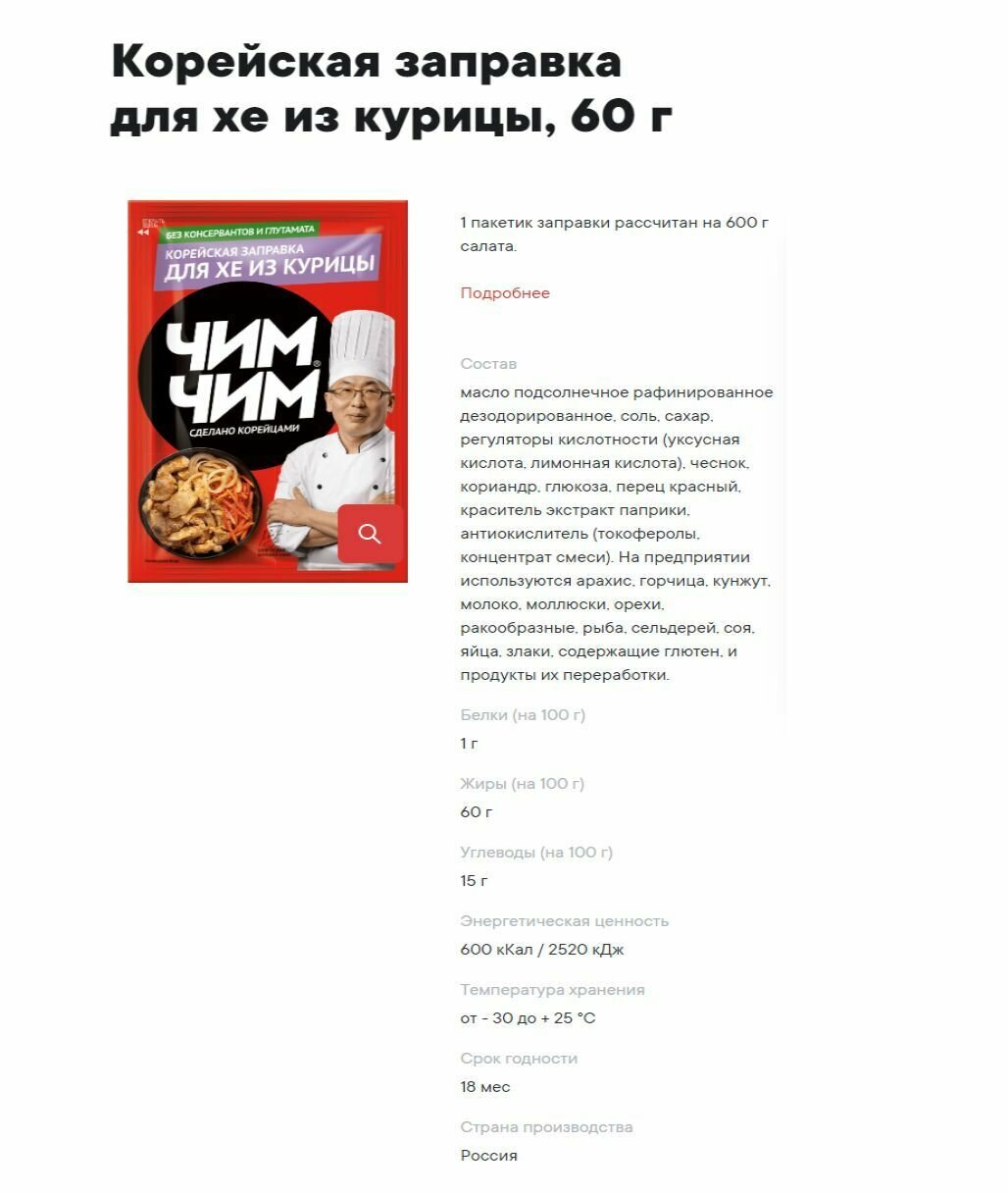 Заправка содержит все необходимые специи и приправы, а также растительное масло и уксус в гармонично подобраных пропорция. Не содержит консервантов.