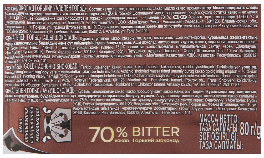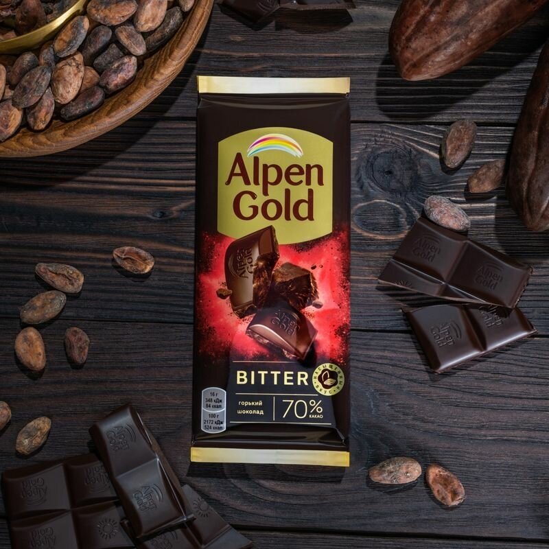 Классический темный шоколад Bitter, в состав которого входит не менее 70 % какао. В меру горький, ароматный, тающий во рту шоколад из натуральных компонентов с минимальным содержанием сахара. Шоколад упакован в пачку с многоразовой застежкой, благодаря чему его удобно носить с собой в сумке.