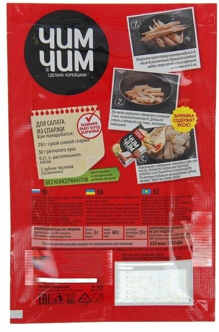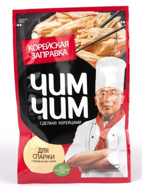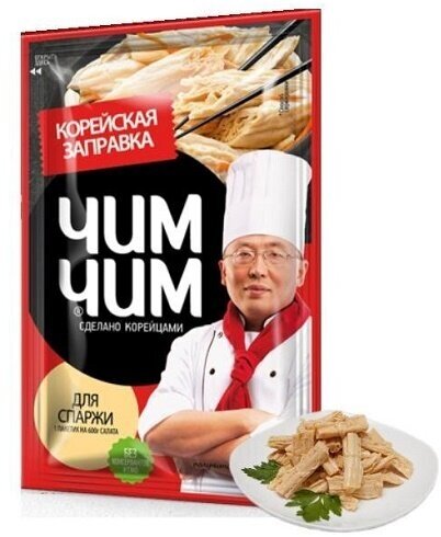 Корейская заправка Чим-Чим позволит быстро и легко приготовить салат из спаржи. Продукт произведен на основе растительных масел, содержит уксус. На обратной стороне упаковки - рецепт приготовления салата из спаржи. Вам понадобится: - 250 г сухой соевой спаржи, - 50 г репчатого лука, - 6 столовых ложек растительного масла, - 1 зубчик чеснока. Приготовление: - Погрузите сухую спаржу в теплую воду на 6-8 часов до размягчения. Промойте холодной водой, слегка отожмите и нарежьте на кусочки по 4-5 см. - Лук мелко нарежьте и обжарьте в сковороде на раскаленном масле. Добавьте спаржу и готовьте 2 минуты, постоянно помешивая. - Переложите содержимое сковороды в глубокую посуду, добавьте содержимое пакетика заправки и все тщательно перемешайте. По желанию добавьте мелкорубленный зубчик чеснока. Через час салат готов.