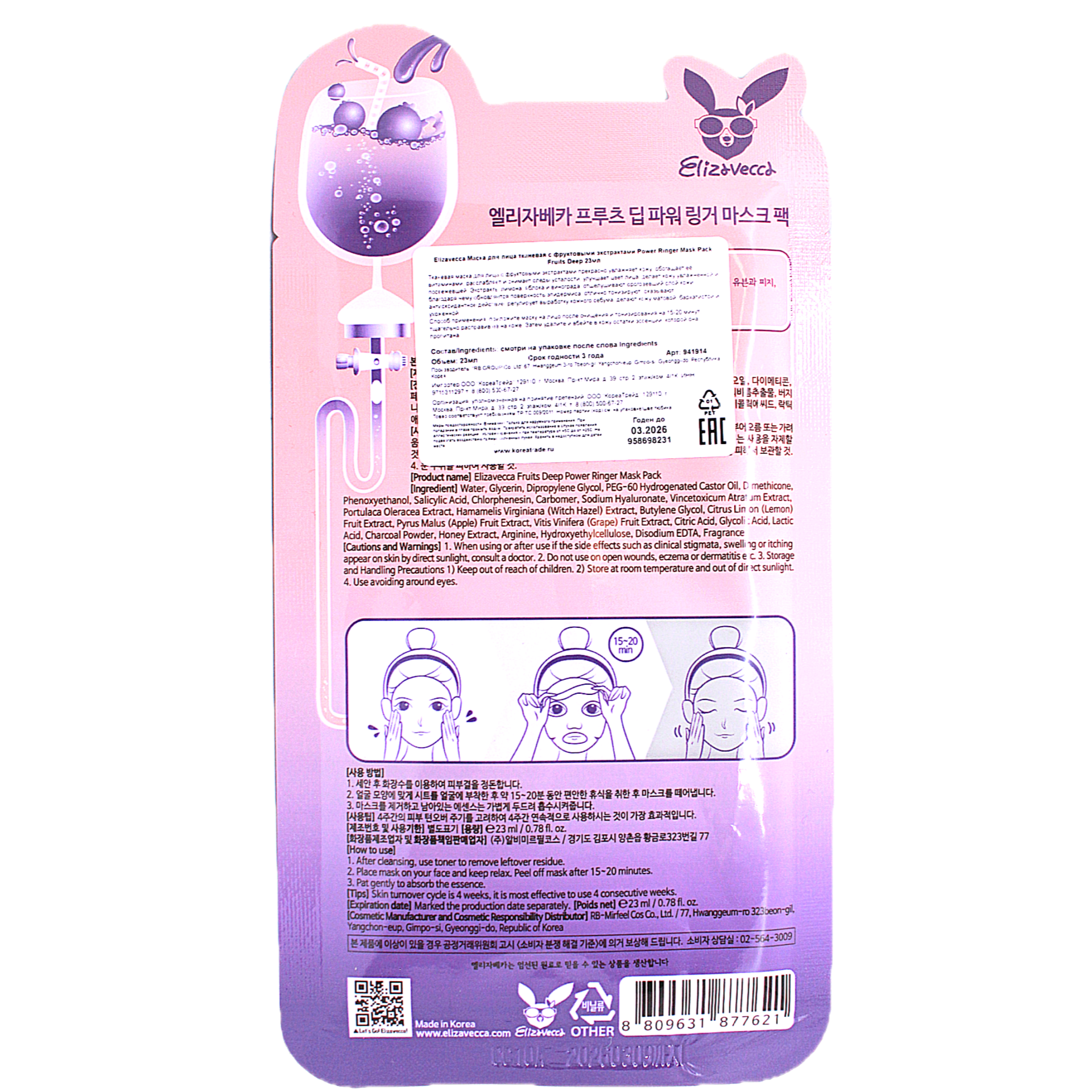На сегодняшний день товар «Маска для лица Elizavecca Fruits Deep Power Ringer Mask Pack тканевая 23 мл» можно купить с кешбеком в 1 магазине: Яндекс.Маркет