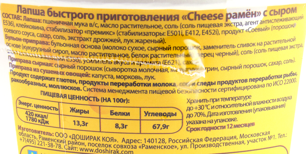 У сырной приправы нет аналога. Сыр придает продукту изысканный вкус и подчеркивает мягкость блюда. Не острое блюдо. Приправа сырная: сырный порошок, ароматизатор «сыр». Приправа из сушеных овощей: капуста, морковь, лук. Продукт содержит глютен, продукты переработки молока, лактозу, сою и продукты ее переработки. Продукт может содержать следы продуктов переработки рыбы.
