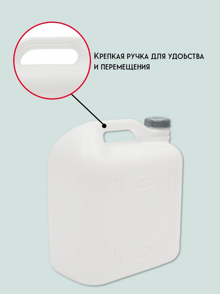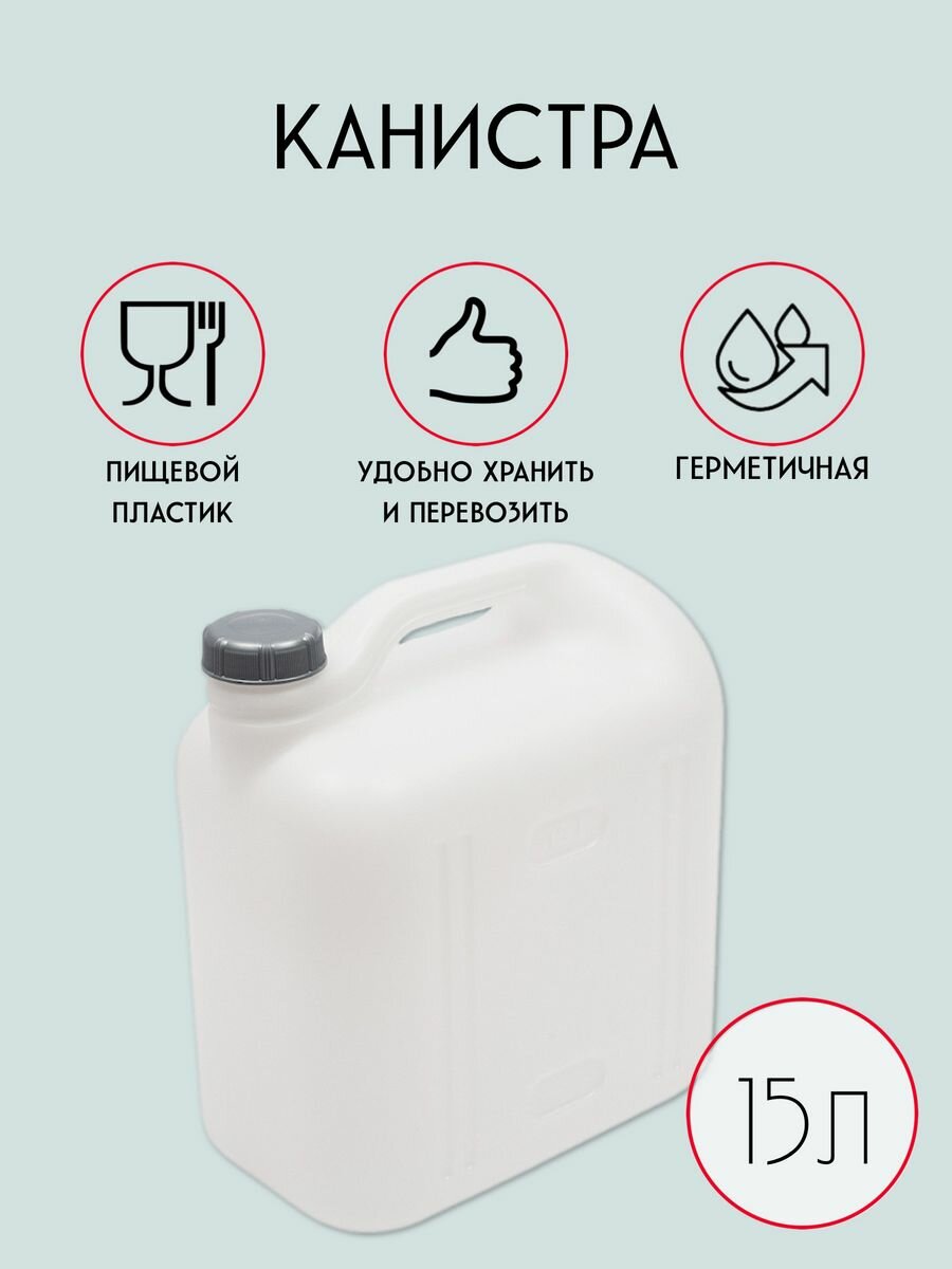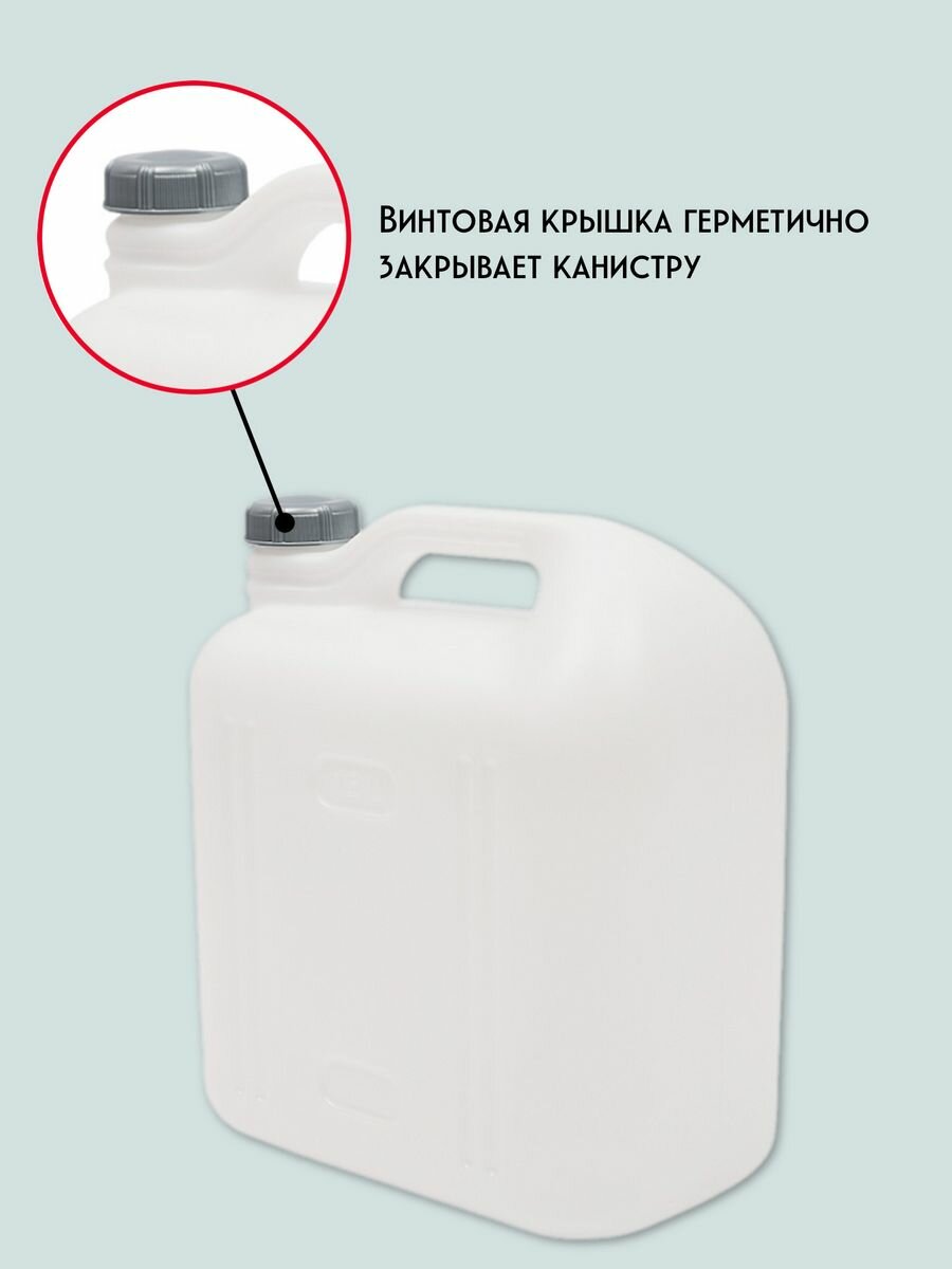 Канистра изготовлена из пищевого пластика, оснащена герметичной крышкой и удобной эргономичной ручкой. Подходит для хранения и транспортировки как пищевых жидкостей (воды, растительного масла, молочных продуктов, соков, патоки, концентратов квасного сусла, этилового спирта и т.п.) так и непищевых технических жидкостей любого назначения.