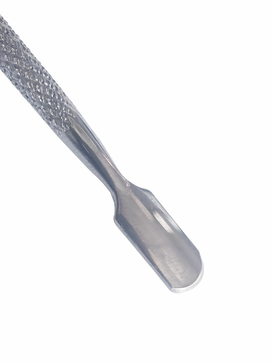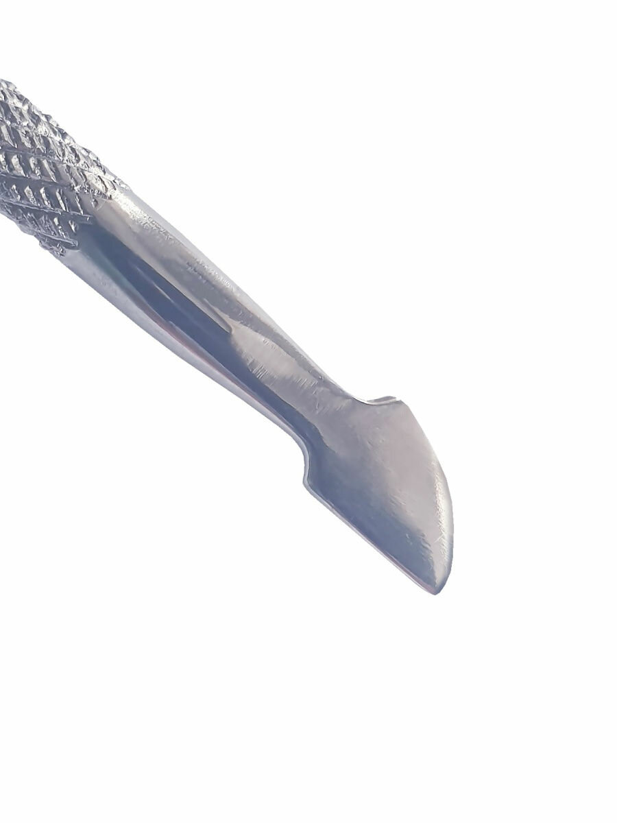 Шабер для кутикулы изготовлен из высококачественной нержавеющей стали и имеет рельефную поверхность, что исключает скольжение инструмента в руках. Одна сторона в виде лопатки предназначена для отодвигания кутикулы, а вторая - для обработки и удаления заусенцев, кутикулы.