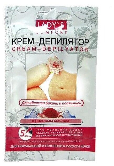 Для чувствительной кожи. Крем для депиляции LADY'S Comfort быстро и эффективно удаляет нежелательные волосы на Вашем теле. Легко смывается во время приёма душа, оставляя кожу мягкой, гладкой и шелковистой.Увлажняющий комплекс «Beauty Wet» насыщает кожу влагой, делая депиляцию очень мягкой.Розовое масло питает кожу, способствует её омоложению и улучшению обменных и восстановительных функций.Регулярное применение крема замедляет рост волос.