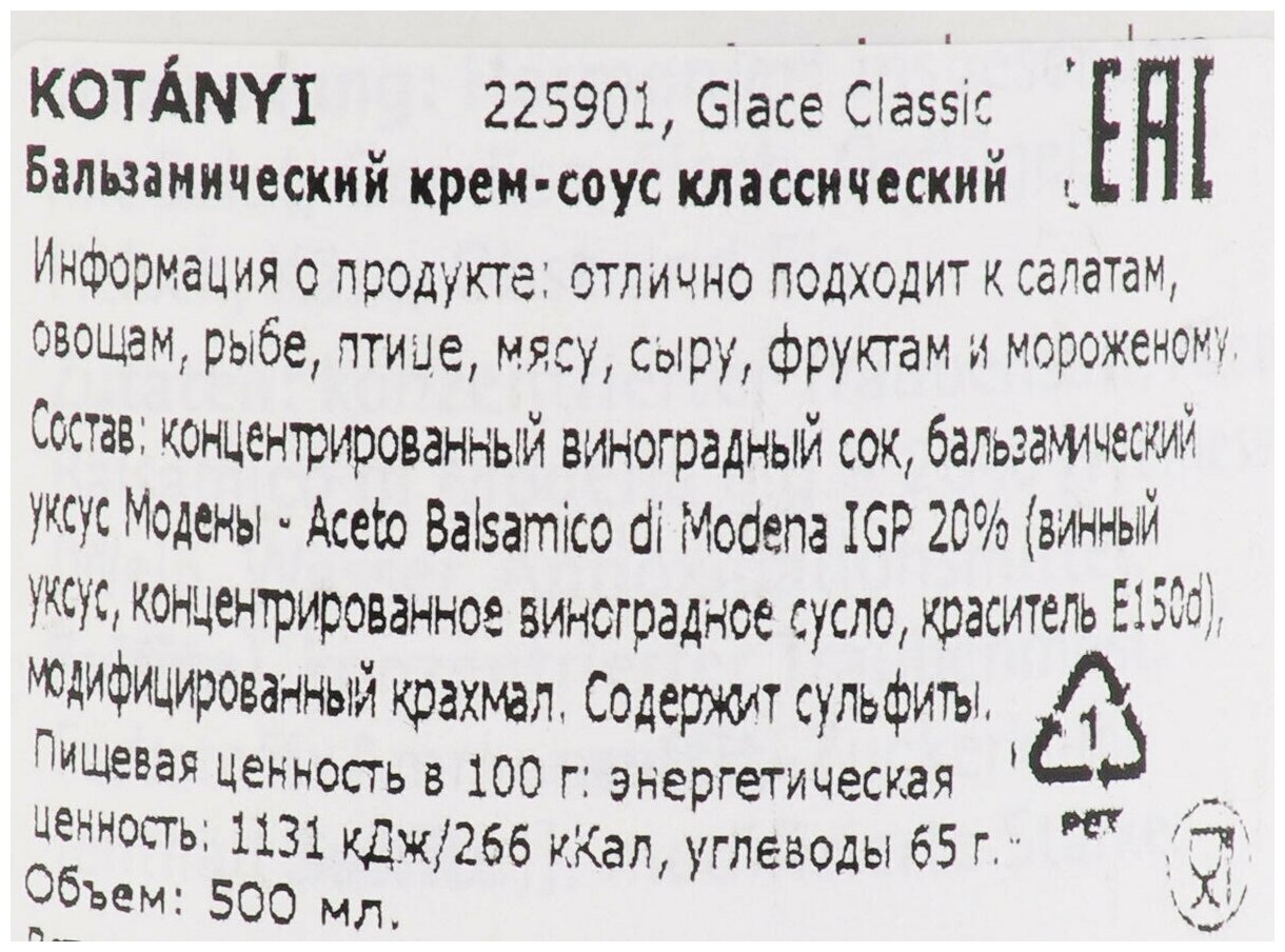 | Состав | Концентрированный виноградный сок, бальзамический уксус Модены - Aceto Balsamico di Modena PGI 20% (винный уксус, концентрированное виноградное сусло, краситель E150d), модифицированный крахмал. Содержит сульфиты. |