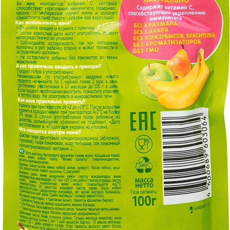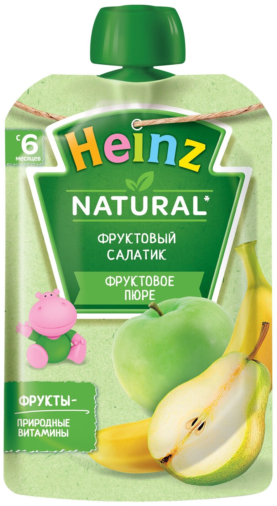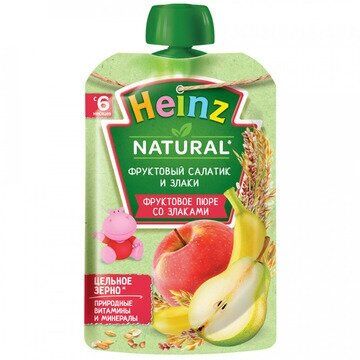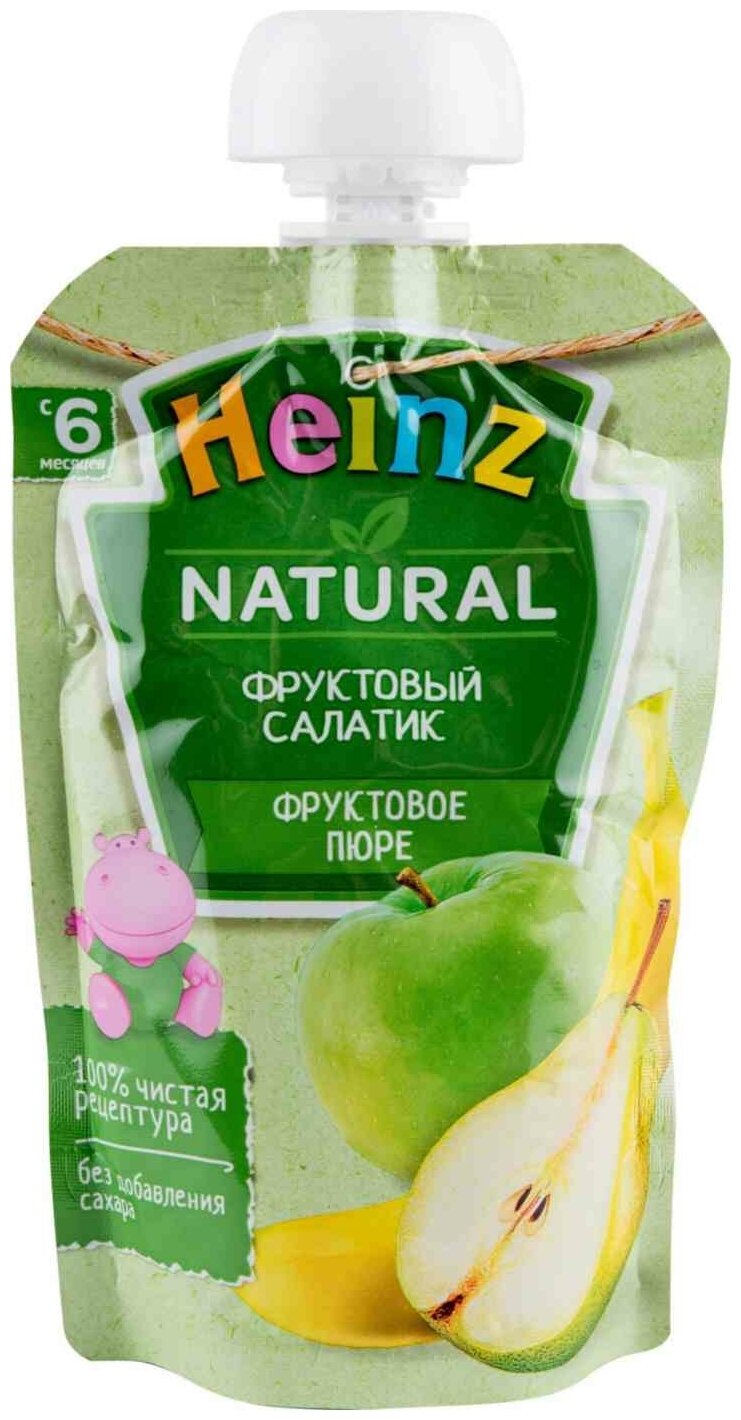 Пюре Heinz Фруктовый салатик с 6 месяцев 100 гр. Яблоки являются источником органических кислот, способствующих усвоению железа. Природные углеводы стимулируют выработку пищеварительных ферментов и повышают аппетит. Содержащийся в яблоках пектин способствует правильной работе кишечника. Сочетание железа и витамина С способствует наилучшему всасыванию железа в кишечнике, что является профилактикой железодефицита у ребенка. Банан источник калия, который необходим для работы мышц и сердца. Углеводы, содержащиеся в бананах, дадут вашему ребенку энергию. В груше содержится много минеральных, азотистых, пектиновых и дубильных веществ, а также витаминов С, P, B1, фитонцидов и флавоноидов. Грушевое пюре благотворно влияет на работу сердечно-сосудистой системы, укрепляет иммунитет, полезно при железодефиците. Природная клетчатка и пектин, способствуют развитию бифидобактерий, нормализуют пищеварительные процессы, улучшают аппетит ребенка. Груша способствует закреплению стула у вашего малыша. Это продукт высочайшего качества, выпускаемый в упаковке, которую удобно взять с собой на прогулку или в дальнюю поездку. Особенности: 100% натурально.Без добавления сахара и крахмала.Содержит витамин С.Без красителей, консервантов, искусственных добавок и ГМО. Рекомендации по употреблению: продукт готов к употреблению. Введение нового продукта начинайте по 1 чайной ложке 2 раза в день, постепенно увеличивая к 12 месяцам до 100 г в день. Если продукт необходимо разогреть, поместите упаковку в теплую воду. Не разогревать в микроволновой печи. Соблюдайте осторожность, так как попадание колпачка в рот ребенка опасно и может привести к затруднению дыхания. Не оставляйте ребенка без присмотра во время кормления. Условия хранения: хранить при температуре от 2C до 25C. После вскрытия хранить в холодильнике не более 24 часов. В случае употребления пюре ребенка из дозатора, дальнейшему хранению не подлежит.