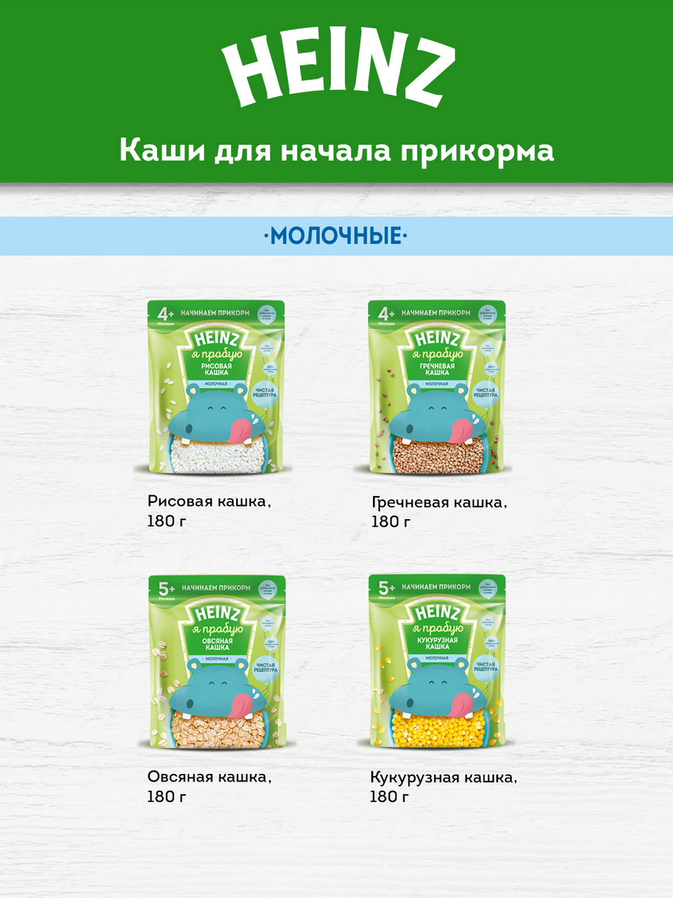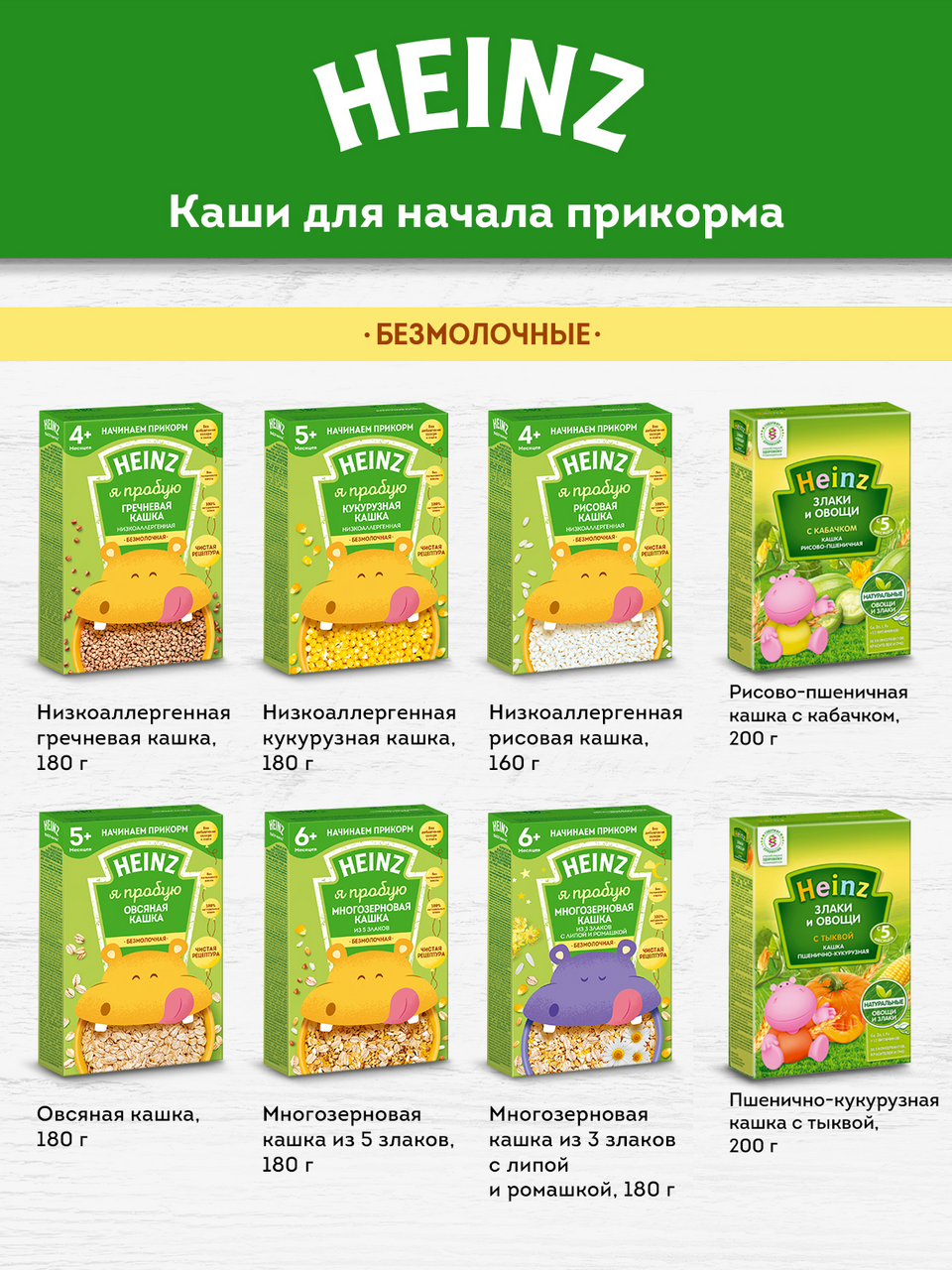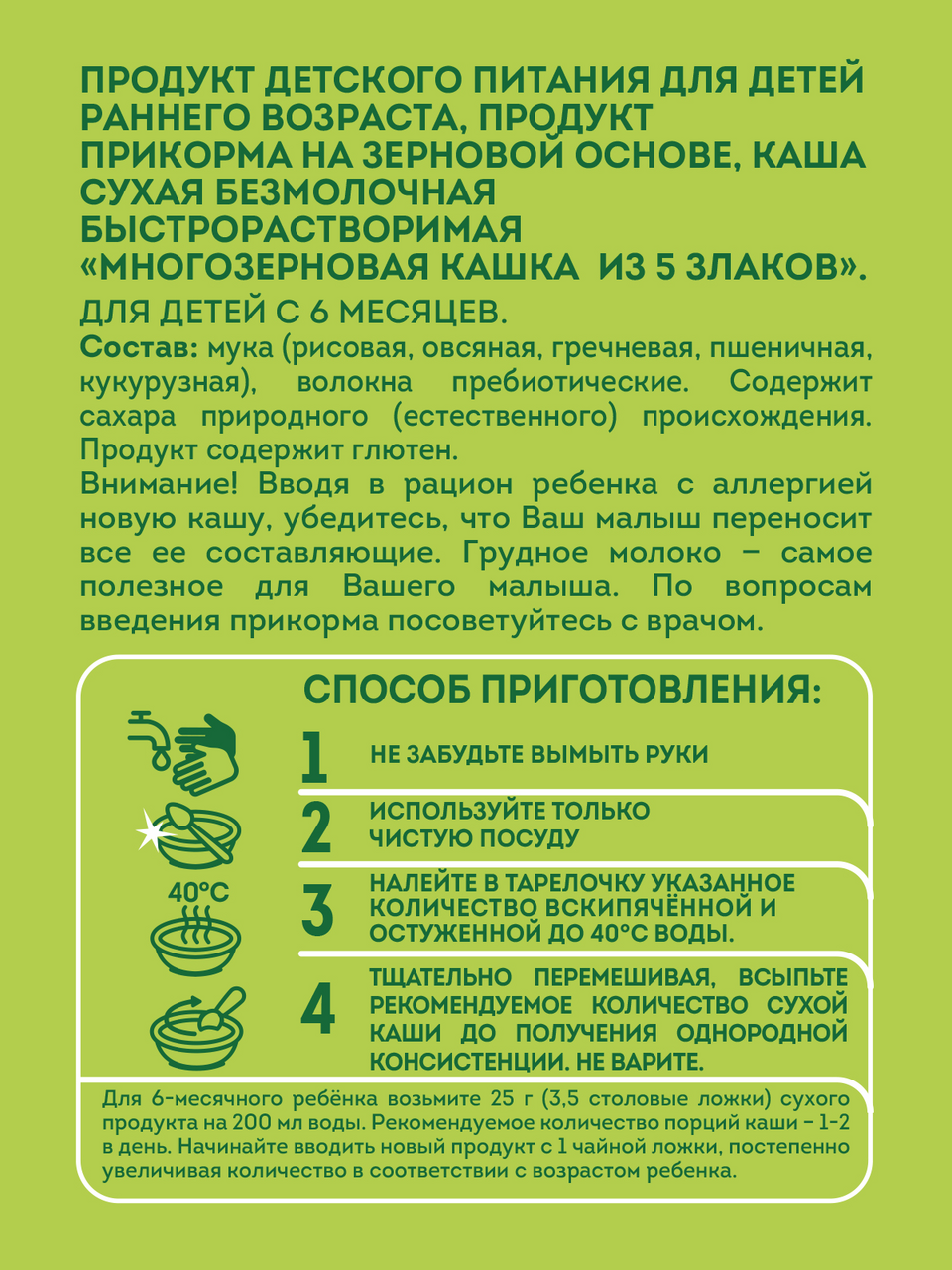 Безмолочные кашки рекомендуются в качестве первого прикорма как здоровым детям, так и детям с аллергией на коровье молоко. Каши, приготовленные из разных круп, особенно полезны, так как они позволяют комбинировать полезные свойства нескольких злаков. Каша содержит 5 злаков: рис, овсянку, гречку, пшеницу и кукурузу. Рис обладает высокой энергетической ценностью, в сочетании с низкой калорийностью, имеет закрепляющее действие. Пшеница богата калием, кальцием и фосфором. Гречка уникальна по содержанию витаминов и микроэлементов, отличается высоким содержанием белка и клетчатки. Гречневую кашу рекомендуется употреблять для профилактики железодефицитной анемии. Овес содержит антиоксиданты, которые повышают иммунитет малыша, стимулирует обменные процессы в организме. Овсяная каша благоприятно влияет на желудочно-кишечный тракт, имеет обволакивающее действие. Кукуруза содержит в своем составе большое количество природной клетчатки.