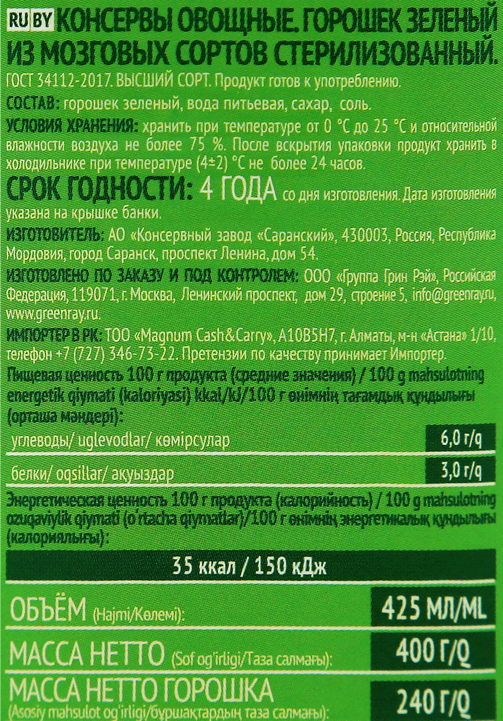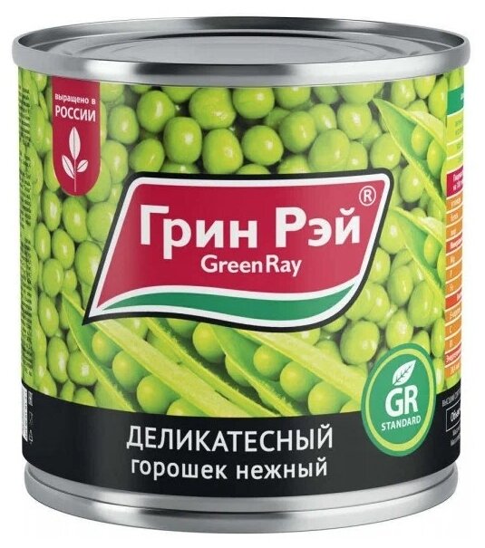 Горошек Green Ray зеленый деликатесный нежный 425мл производится из отборного гороха мозговых сортов, выращенного на собственных полях компании в Краснодарском крае. Особая технология стерилизации позволяет сохранить в нем все полезные свойства, витамины и минералы. Согласно лабораторным исследованиям Роскачества, продукт соответствует ГОСТ и относится к высшему сорту. Горошинки цельные, без мусора и шелухи, одинакового цвета и консистенции. При производстве не используется замороженное сырье, ГМО, искусственные добавки, консерванты и усилители вкуса.