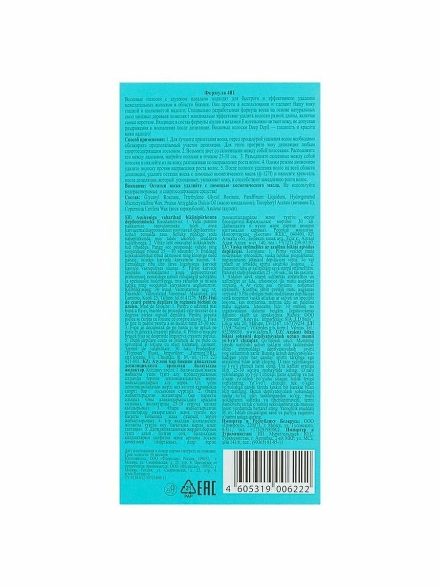 | Комплектация | Восковые полоски для депиляции Floresan Deep depil с Азуленом 20 шт |