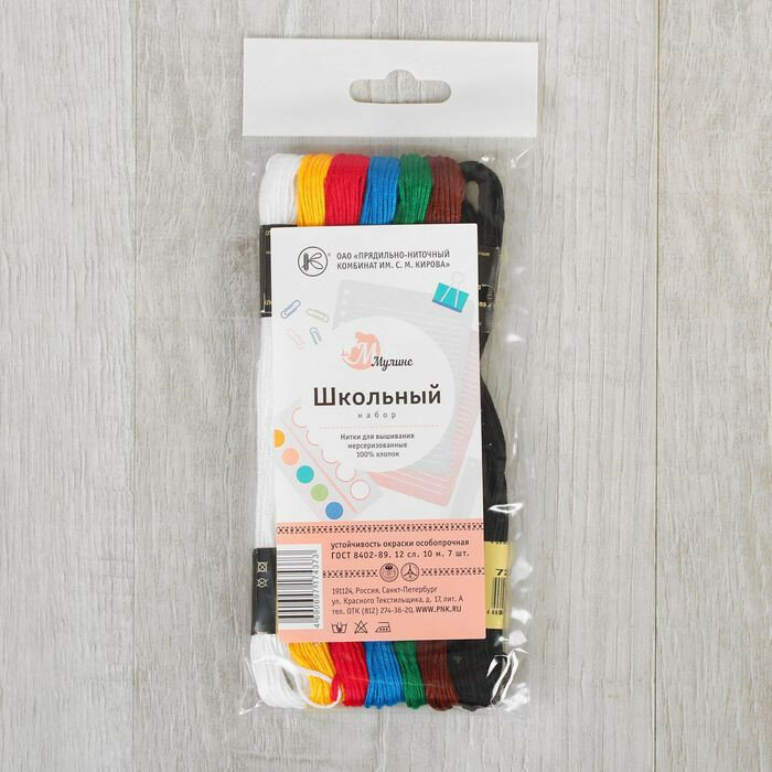 Набор ниток мулине "Школьный", 10 ± 1 м, 7 штЕсли ваше хобби — вышивание, то вы знаете, как важен выбор нитей. Мулине отличается высоким качеством и стойкой окраской, не линяет даже после стирки и не выгорает на солнце, не раскручивается и не пушится, что гарантирует его прочность и надёжность.С набором ниток разных цветов вы сможете вышить своими руками необычные и красивые вещи. Вышивайте праздничные узоры на скатертях и салфетках, создавайте целые картины или отдельные декоративные элементы.Нитки от торговой марки ПНК им. Кирова — это тандем высокого качества и современных технологий. Нити из 100% хлопка не раз награждались "Знаком качества": они проходят особую обработку, в ходе которой им придают блеск, яркость и стойкость цвета.