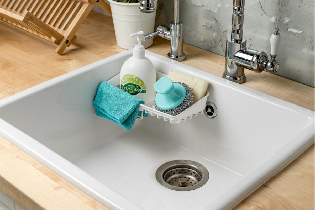 Держатель позволяет освободить плоскость возле раковины на кухне от моющего средства, губок и прочего и сэкономить место. Хранение губки и тряпки в держателе позволяет лишней жидкости стекать прямо в раковину и уберегает поверхность столешницы от избыточной влажности, а сетчатый корпус держателя обеспечивает быстрое просыхание губки или тряпки, предотвращает развитие на них грибка.