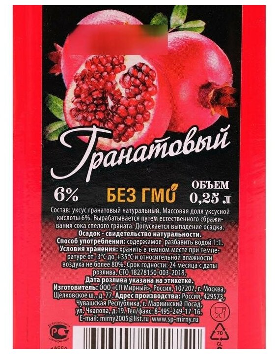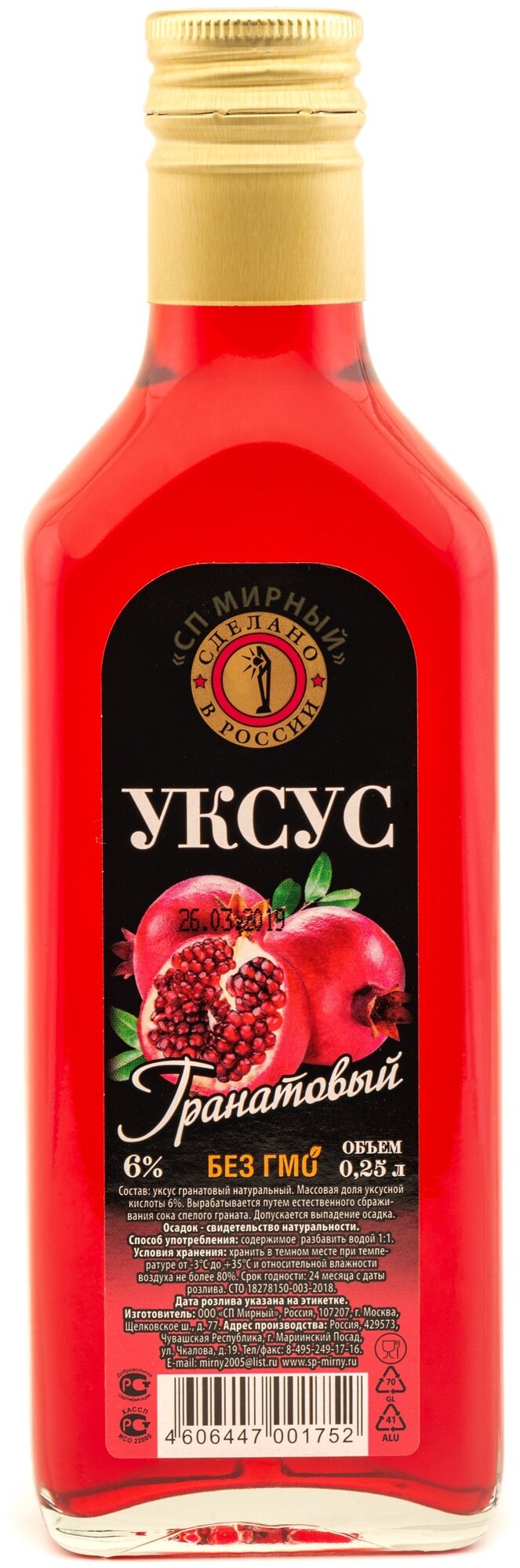 Уксус гранатовый «СП Мирный» натуральный 6% 250 мл