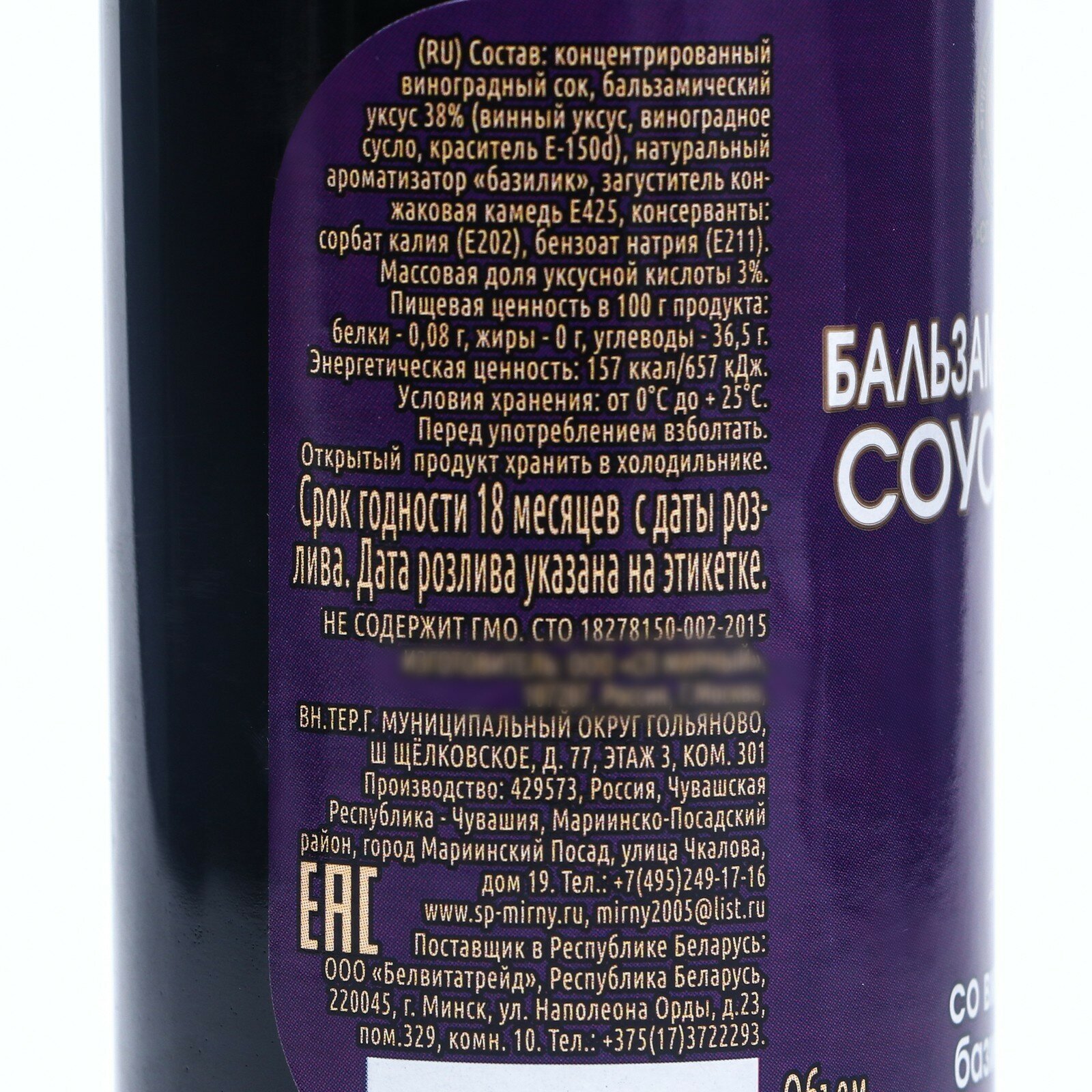 | Состав | Бальзамический уксус (виноградный уксус, концентрированный виноградный сок, краситель карамельный e150d), сахар, концентрированный виноградный сок, загуститель гуаровая камедь, ароматизатор пищевой натуральный «базилик», консерванты |